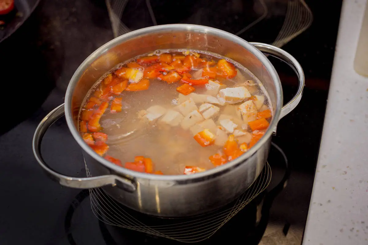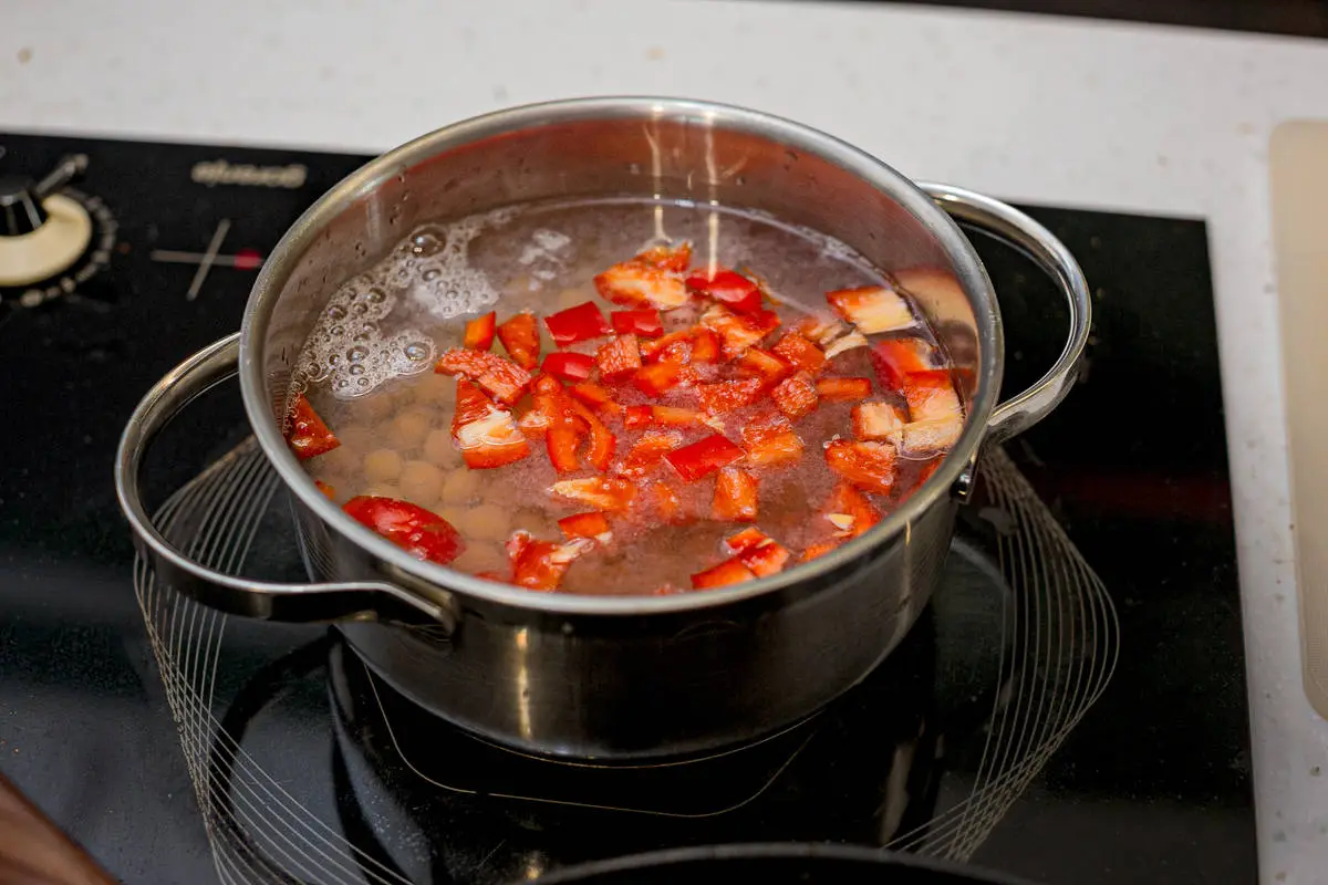 Нарежьте сладкий перец кубиками, добавьте к нуту. Доведите суп до кипения и убавьте огонь, варите 2-3 минуты.