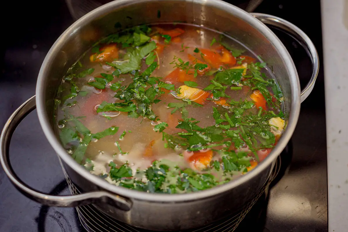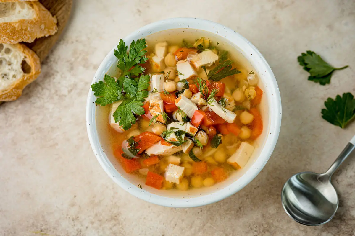 Нарежьте куриную грудку кубиками, добавьте в кастрюлю, прогрейте ещё минуту и снимите суп с огня.