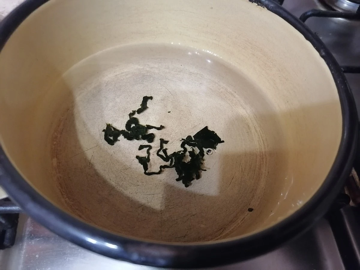 Налейте в ковш холодной воды, бросьте 2 щепотки вакаме и поставьте ковш на огонь. Варите водоросли 2,5 минуты после закипания.