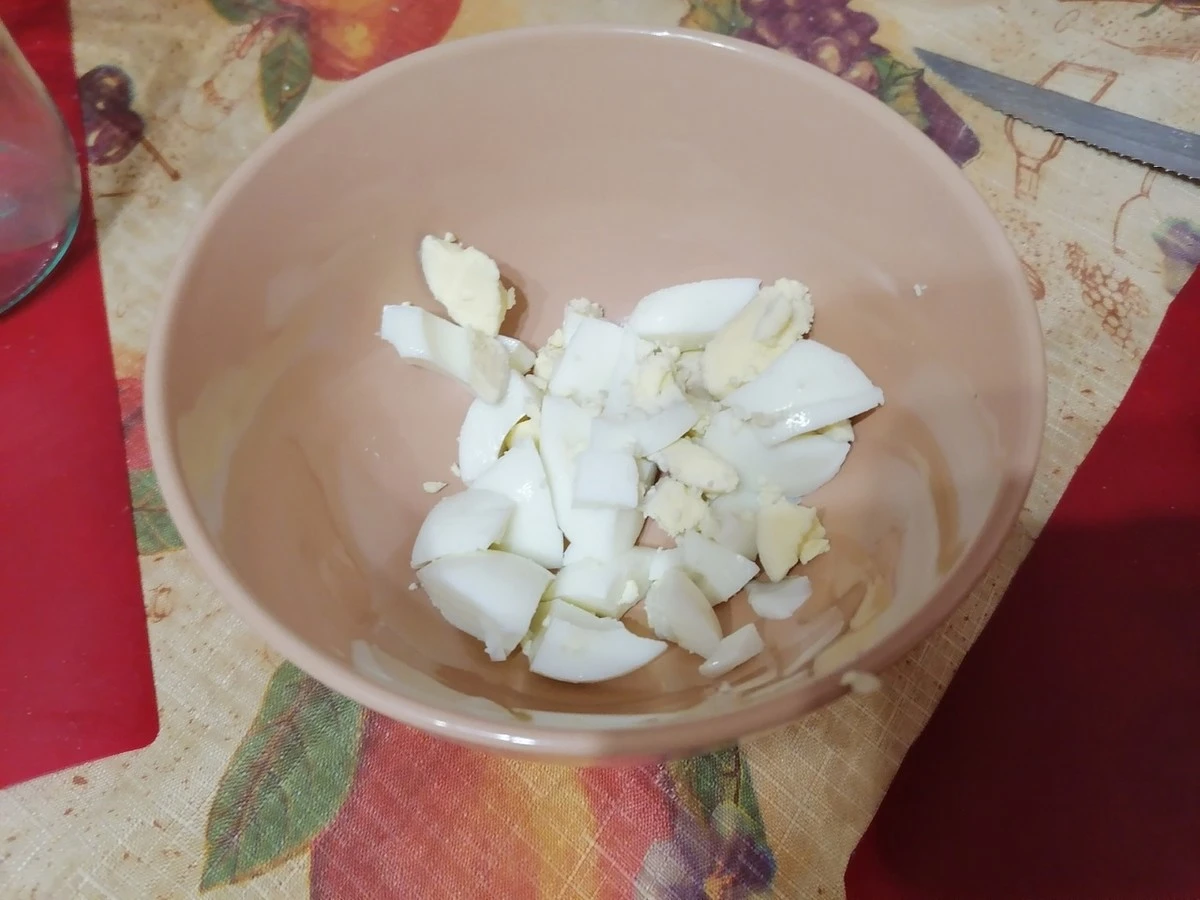 Очистите яйцо от скорлупы. В отдельную ёмкость нарежьте яйцо на кусочки, порежьте сыр кубиками.