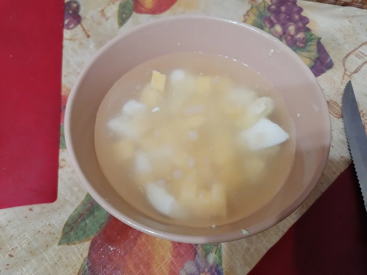 Разогрейте бульон, добавьте его в ёмкость с сыром и яйцом. Перемешайте, чтобы сыр не склеился.