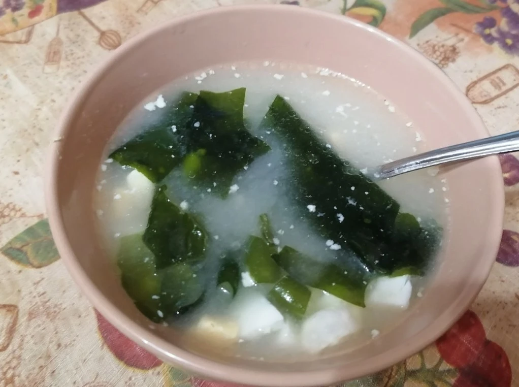 Добавьте в бульон разбухшие водоросли вакаме и наслаждайтесь вкуснейшим лёгким супом.