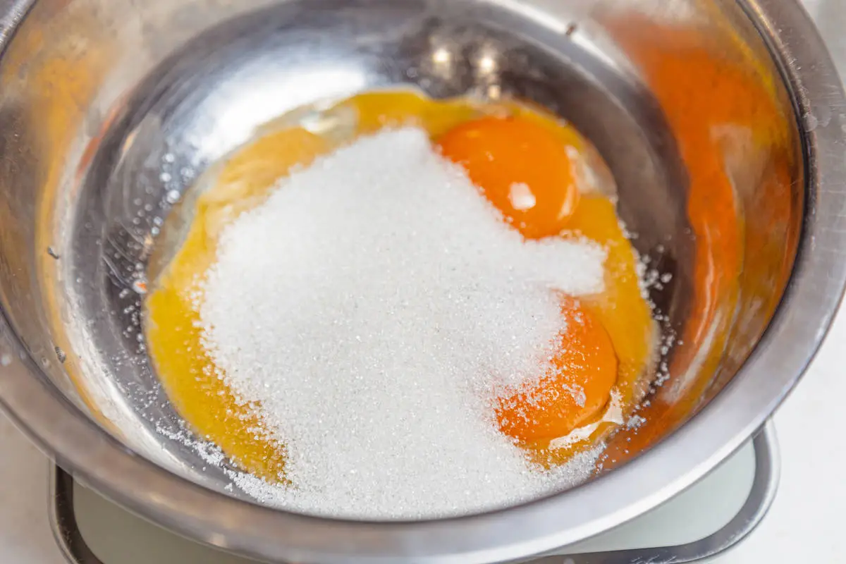 Сначала сварите крем для «Наполеона». Желтки отделите от белков (белки не понадобятся) и разотрите с сахаром.