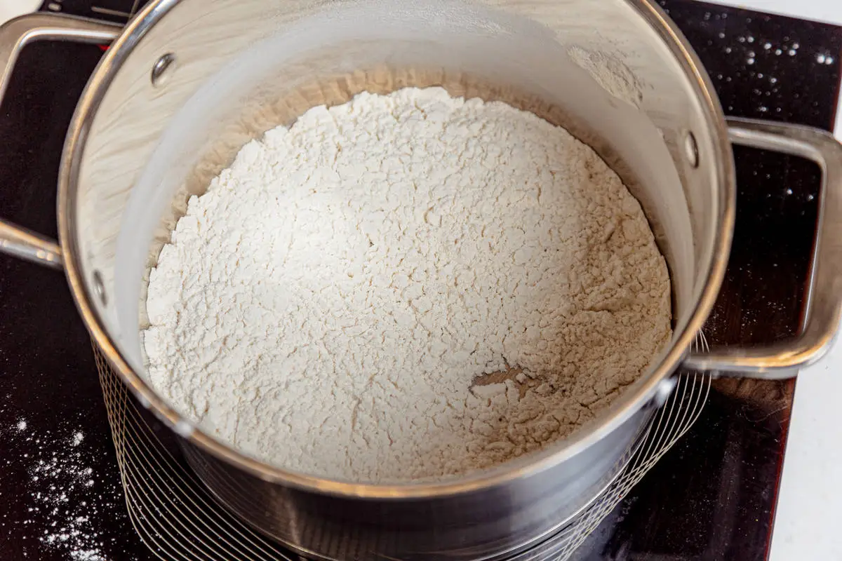 Муку обжарьте в сухой кастрюле до светло-кремового цвета и орехового аромата.