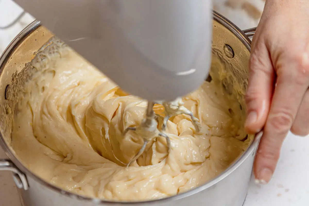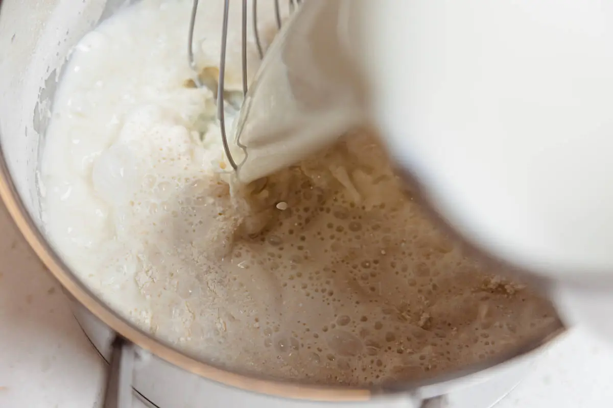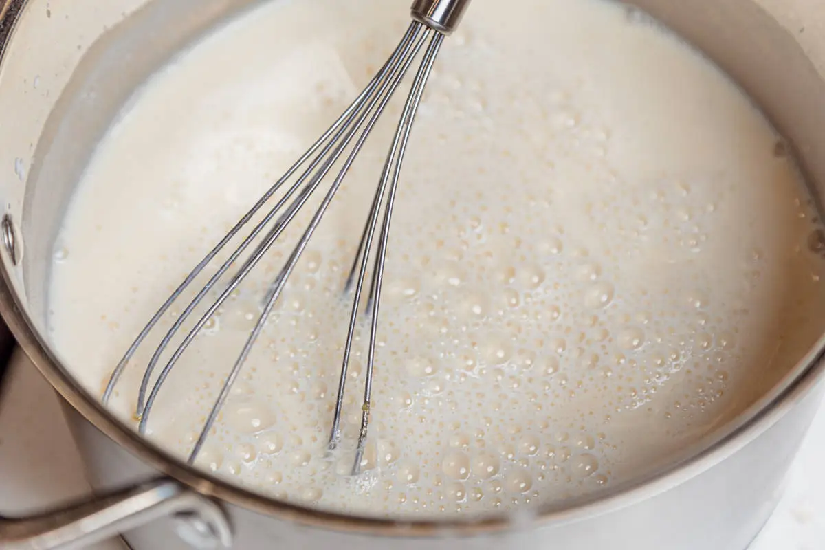 Молоко подогрейте до 60-70 °C и влейте в муку, тщательно смешайте при помощи венчика.