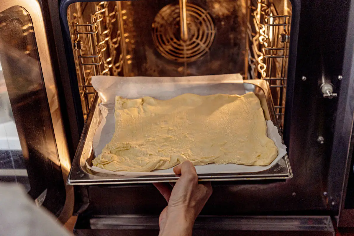 Духовку разогрейте до 220 °C. Тесто растяните в квадрат, выложите на противень на лист пергамента и поставьте в духовку на 10 минут. Затем убавьте температуру до 190 °C и выпекайте до золотистости (ещё около 25 минут).