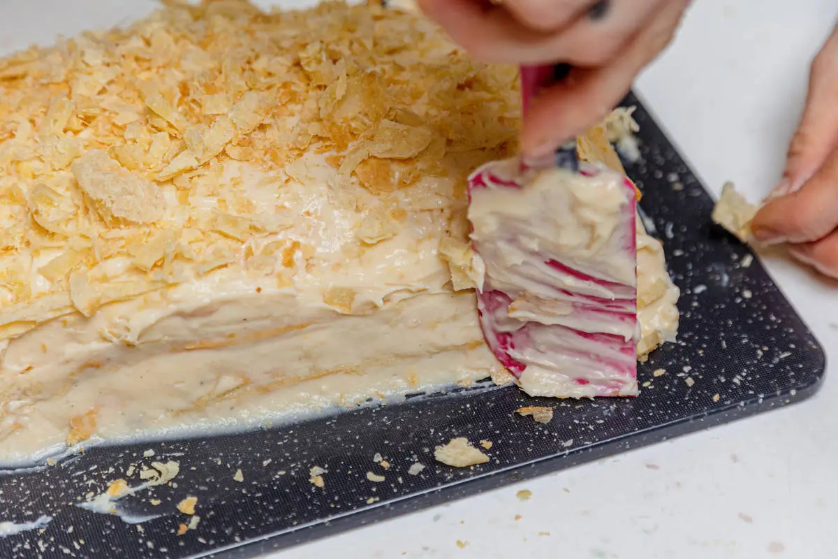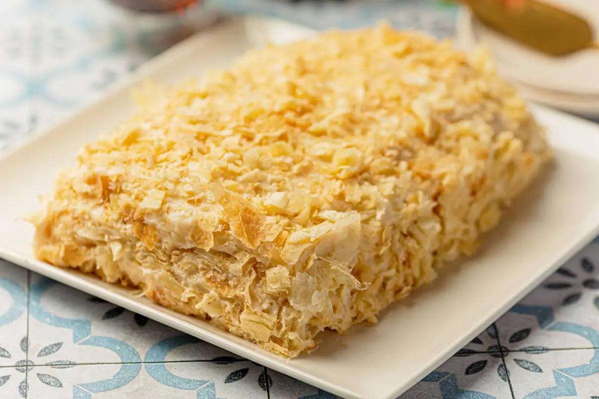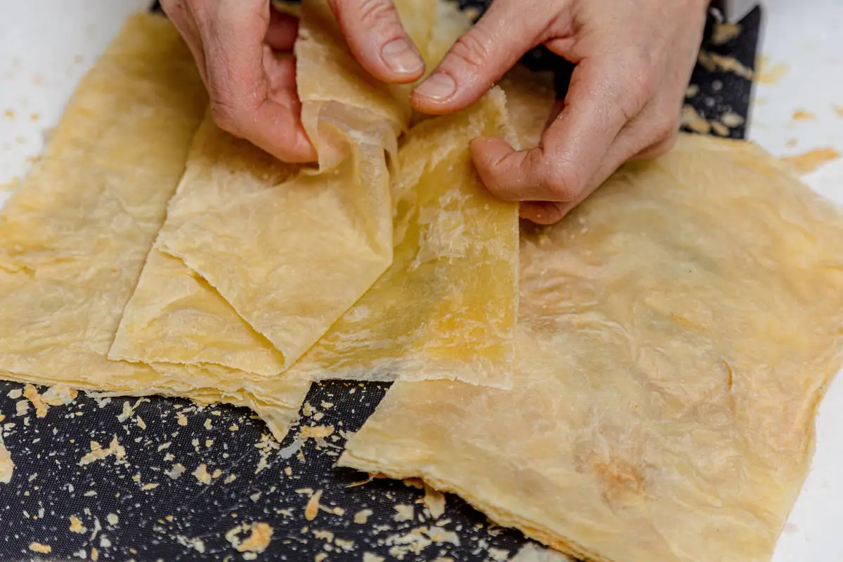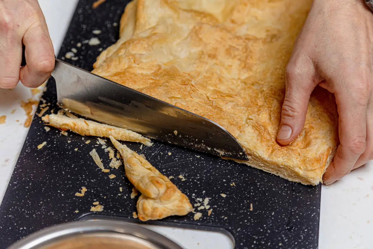 Готовое тесто остудите. Отрежьте края, чтобы получился ровный квадрат или прямоугольник, снимите верхний золотистый слой. Все крошки и обрезки сохраните.