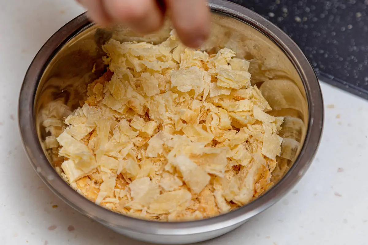 Крошки и обрезки нарежьте мелко и подсушите в духовке при 180 °C ещё 5 минут.