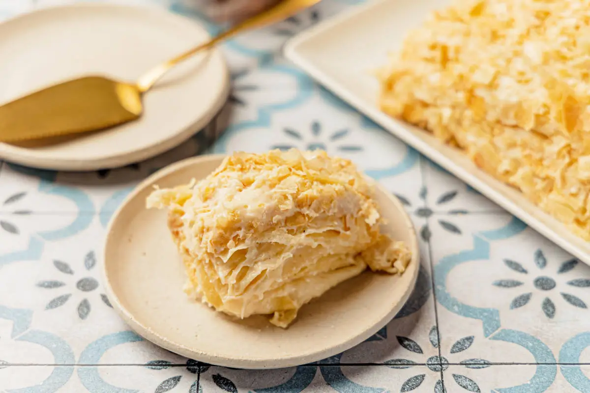 Домашний «Наполеон» — нежный на вкус торт, с большим количеством крема и лимонным ароматом. Вместо лимонной цедры можно добавить молотую ваниль.