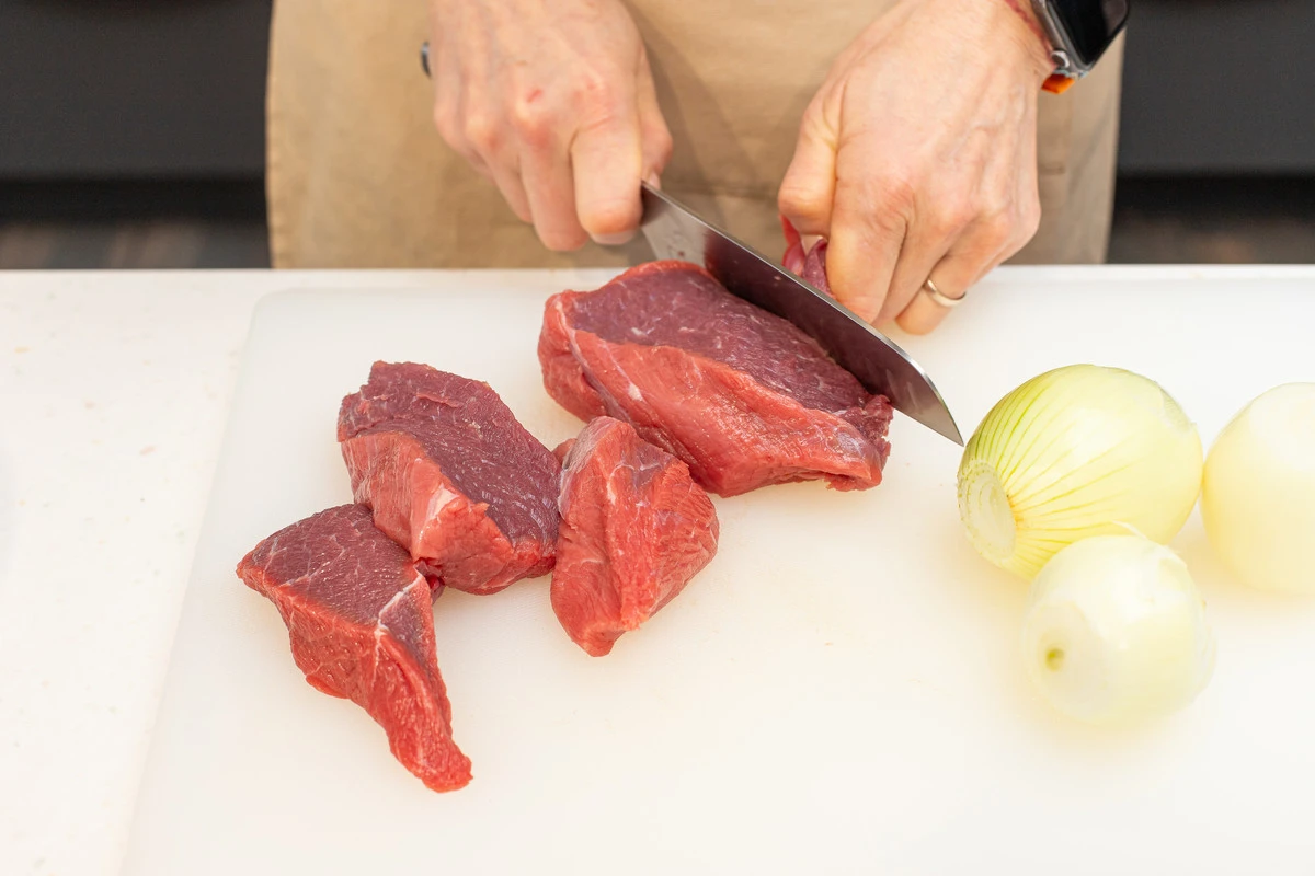 Мясо нарежьте кусочками небольшого размера. Лук почистите и нарежьте четвертинками колец.