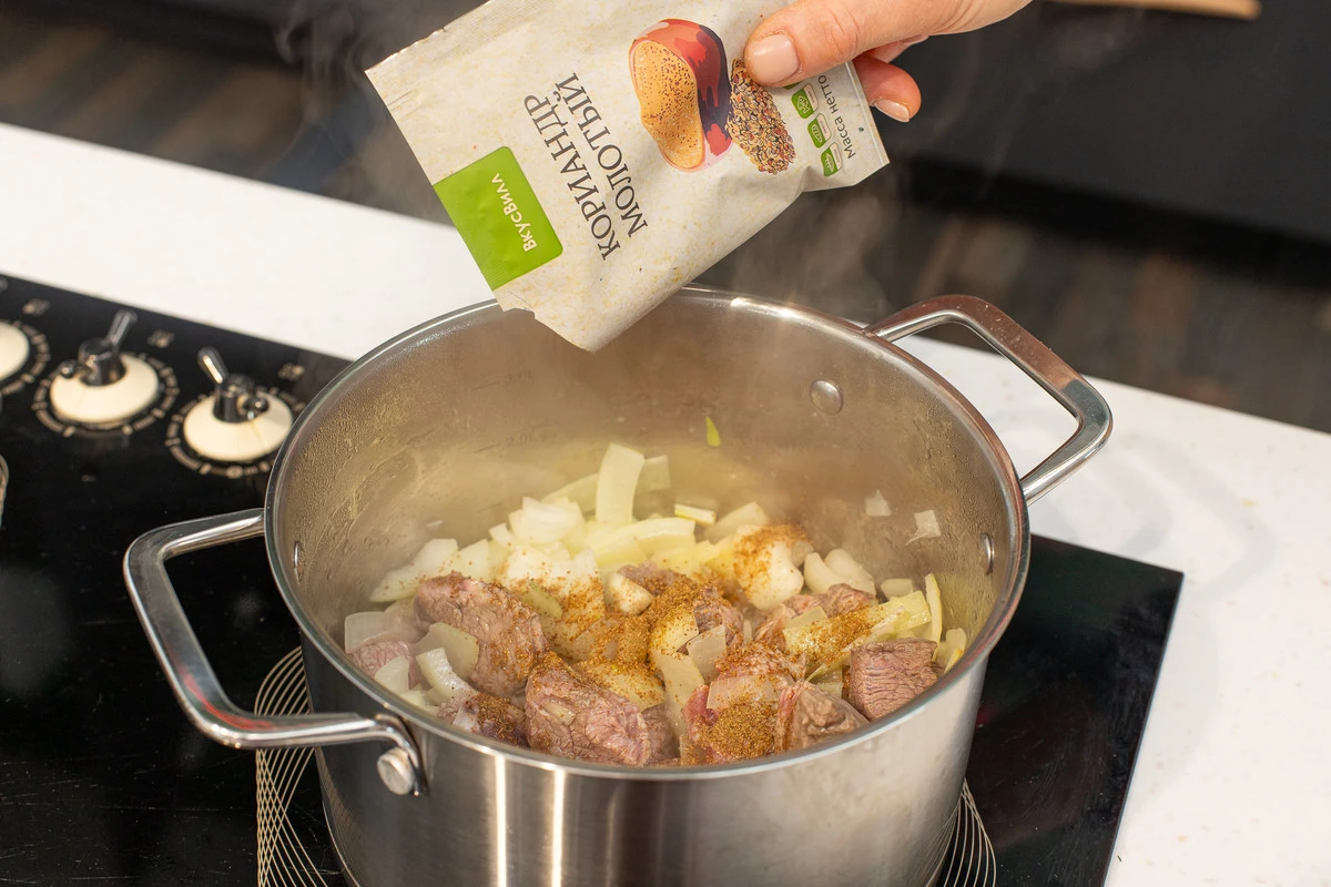 Разогрейте кастрюлю и выложите в неё мясо и лук, добавьте кориандр и перемешайте. Накройте крышкой и готовьте на средне-слабом огне примерно 30 минут.