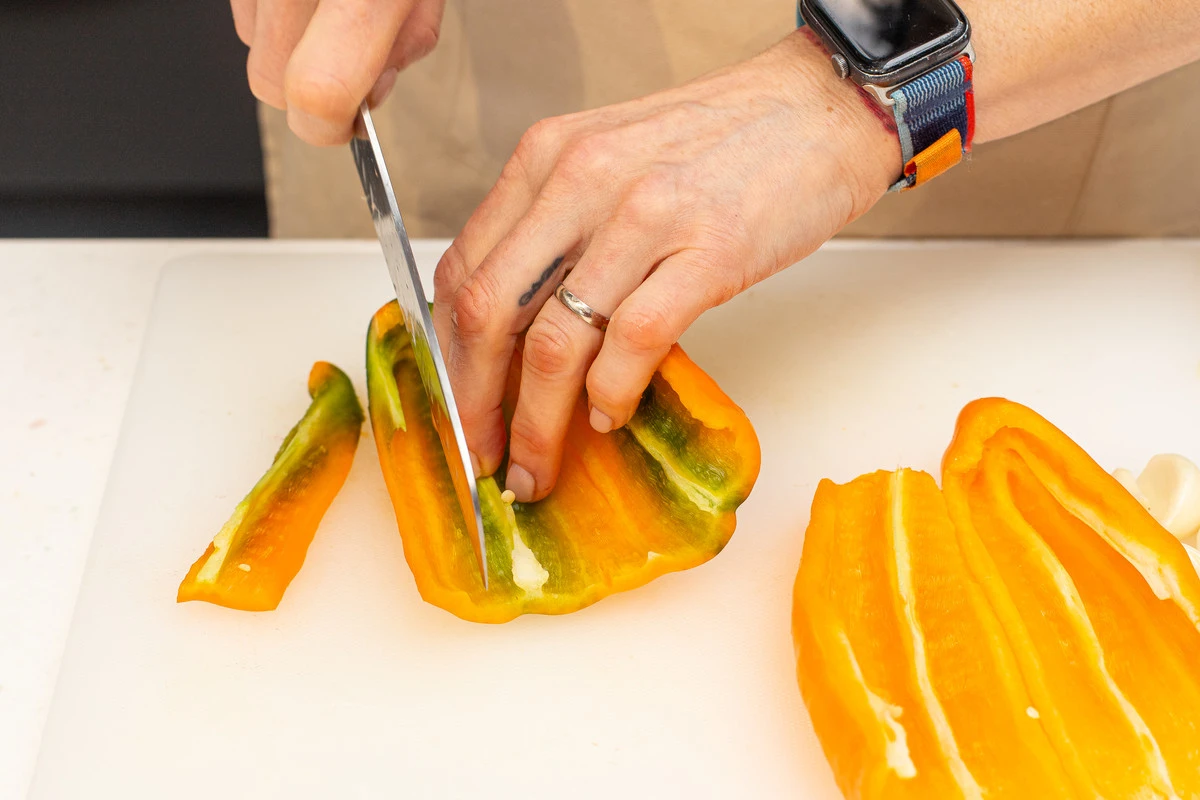 Перец очистите от семян и нарежьте кусочками среднего размера.
