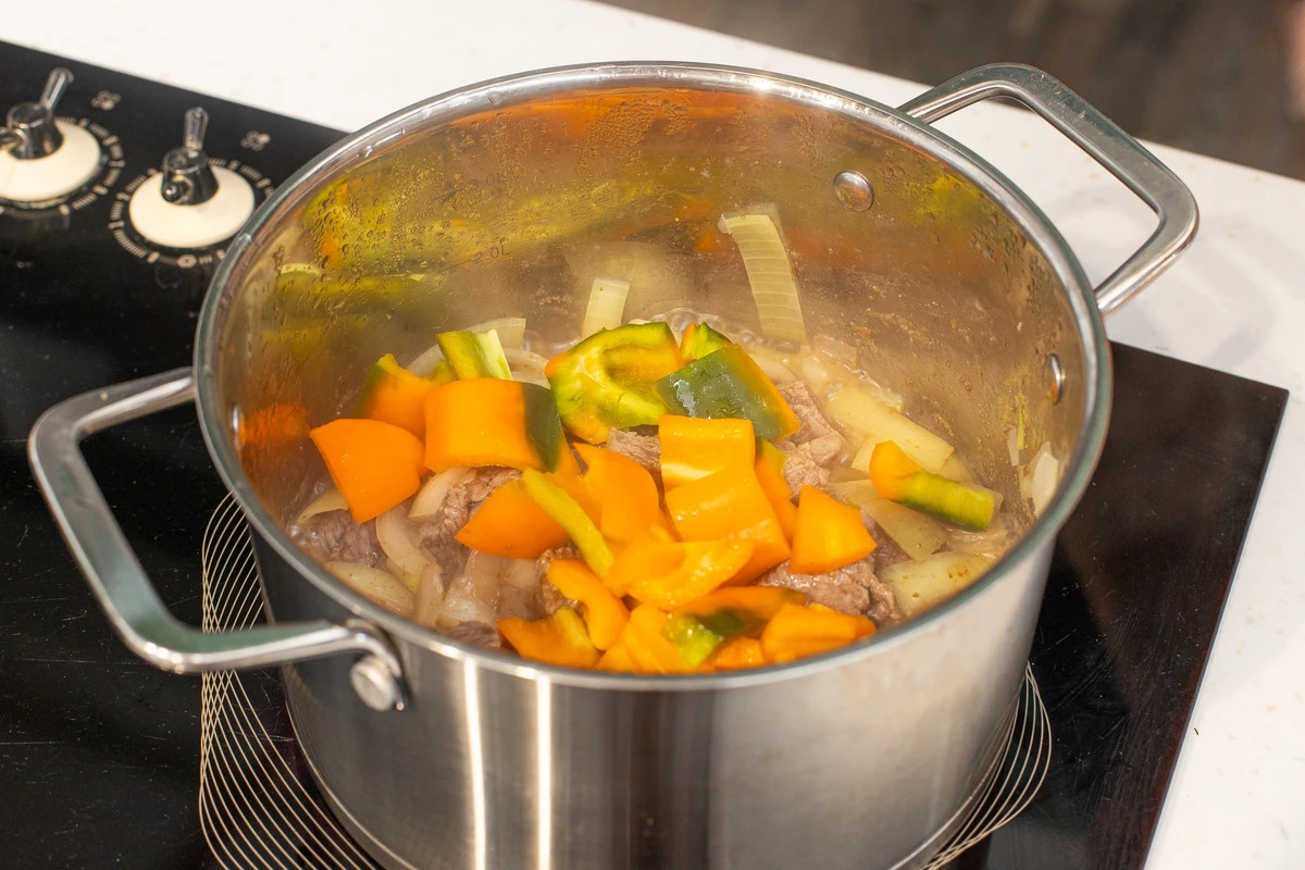 Добавьте к мясу с луком и готовьте под крышкой ещё примерно 15 минут.