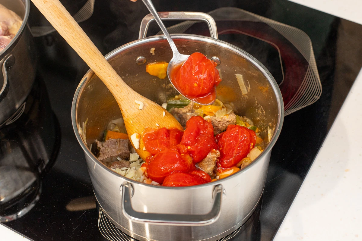 Чеснок почистите и нарежьте кусочками. Добавьте томаты в собственном соку вместе с соком и нарезанный чеснок к мясу.