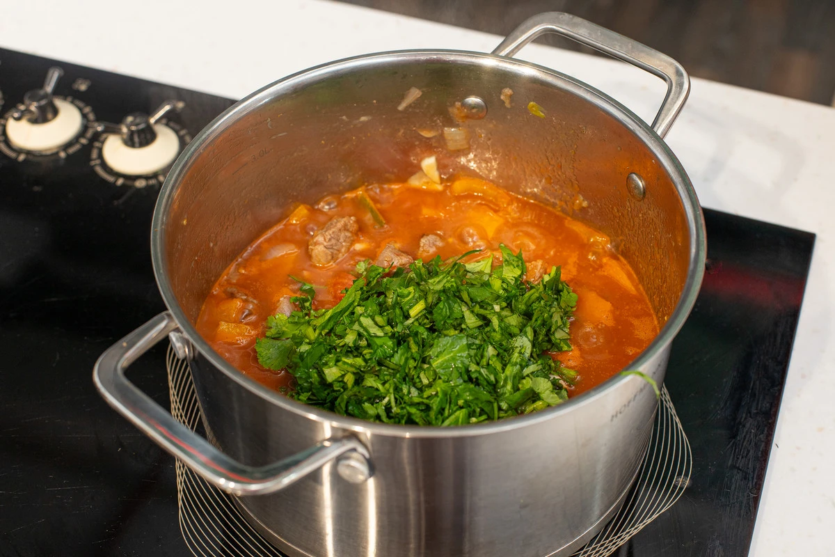Зелень нарежьте и также положите в кастрюлю. Добавьте специи, острый перец по желанию, перемешайте и тушите всё вместе ещё минут 20–30. Затем снимите кастрюлю с чашушули с огня и оставьте настаиваться под крышкой ещё 20–30 минут.
