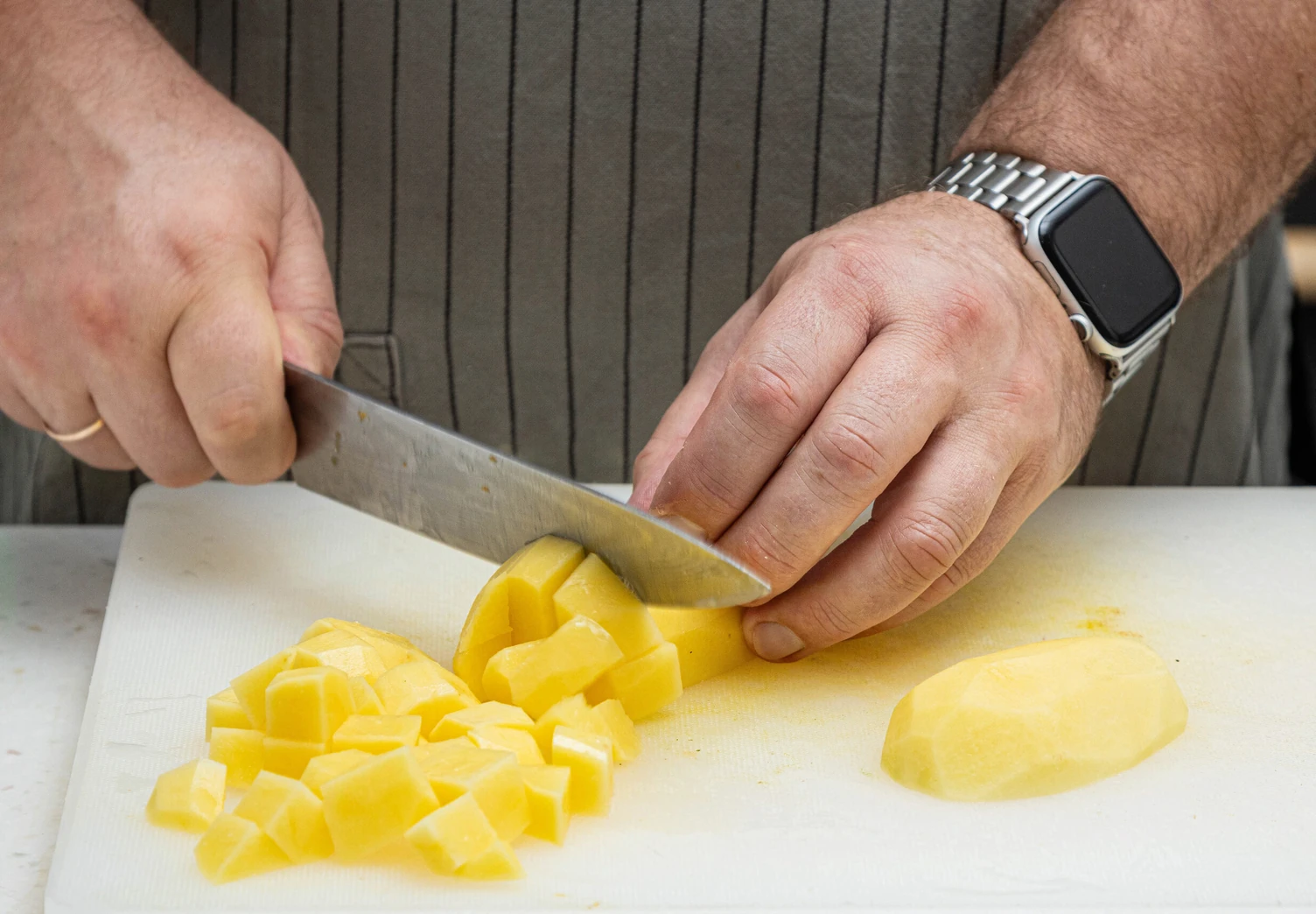 Подготовьте все продукты: бекон и очищенный картофель нарежьте небольшими кубиками, лук — мелко.