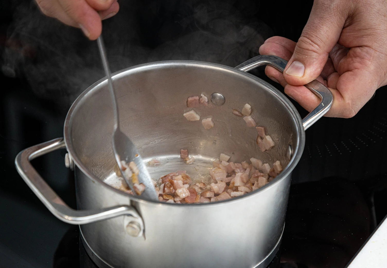 Обжарьте бекон в кастрюле на среднем огне до хрустящего состояния. Половину переложите на тарелку и отставьте в сторону.