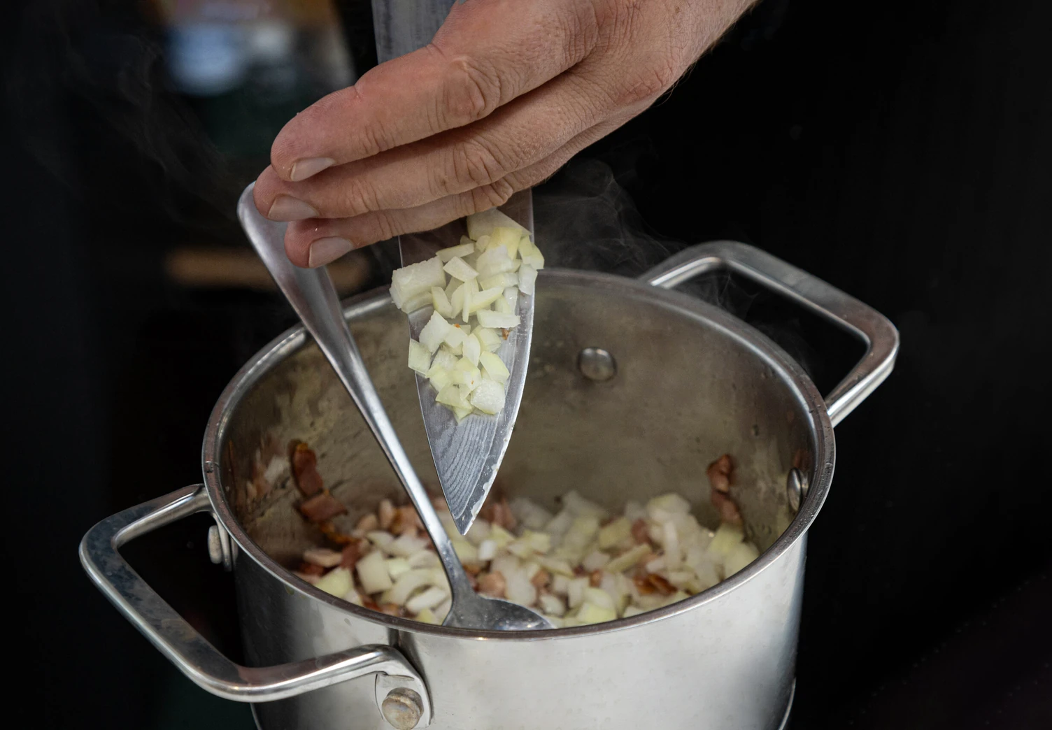 К бекону в кастрюле добавьте лук и готовьте помешивая около 5 минут, пока он не станет мягким.