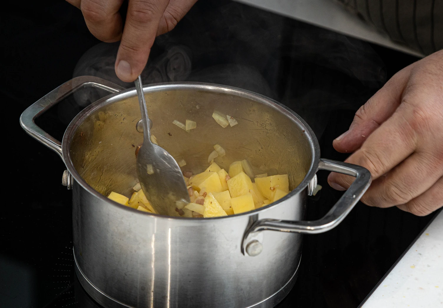 Добавьте в кастрюлю нарезанный картофель и готовьте помешивая 1–2 минуты.