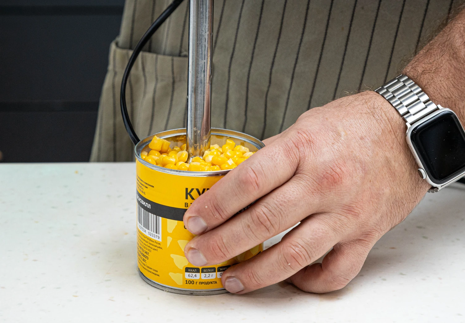 Консервированную кукурузу вместе с жидкостью измельчите в миске до состояния пюре.