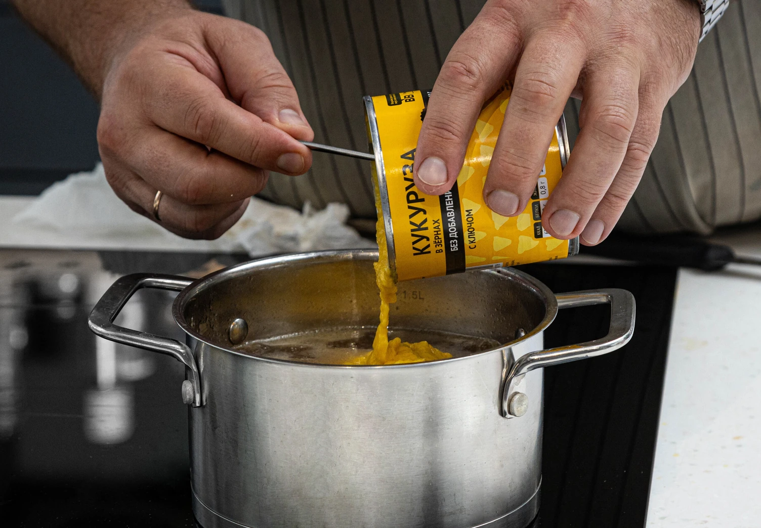 Влейте в кастрюлю бульон или воду, добавьте кукурузное пюре, посолите по вкусу и хорошо размешайте. Доведите до кипения. Как только суп закипит, убавьте огонь, прикройте кастрюлю крышкой и варите, изредка помешивая, до готовности картофеля.
