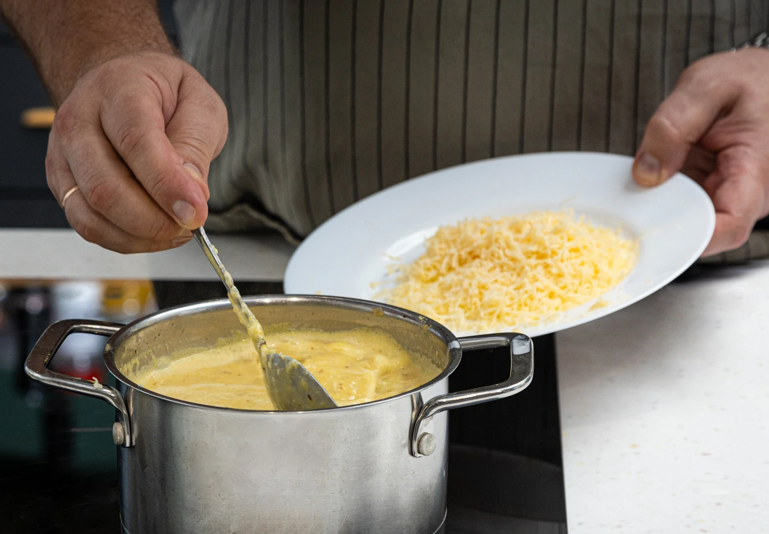 Добавьте в суп тёртый сыр, снова поставьте на небольшой огонь. Прогрейте помешивая, пока сыр не расплавится.