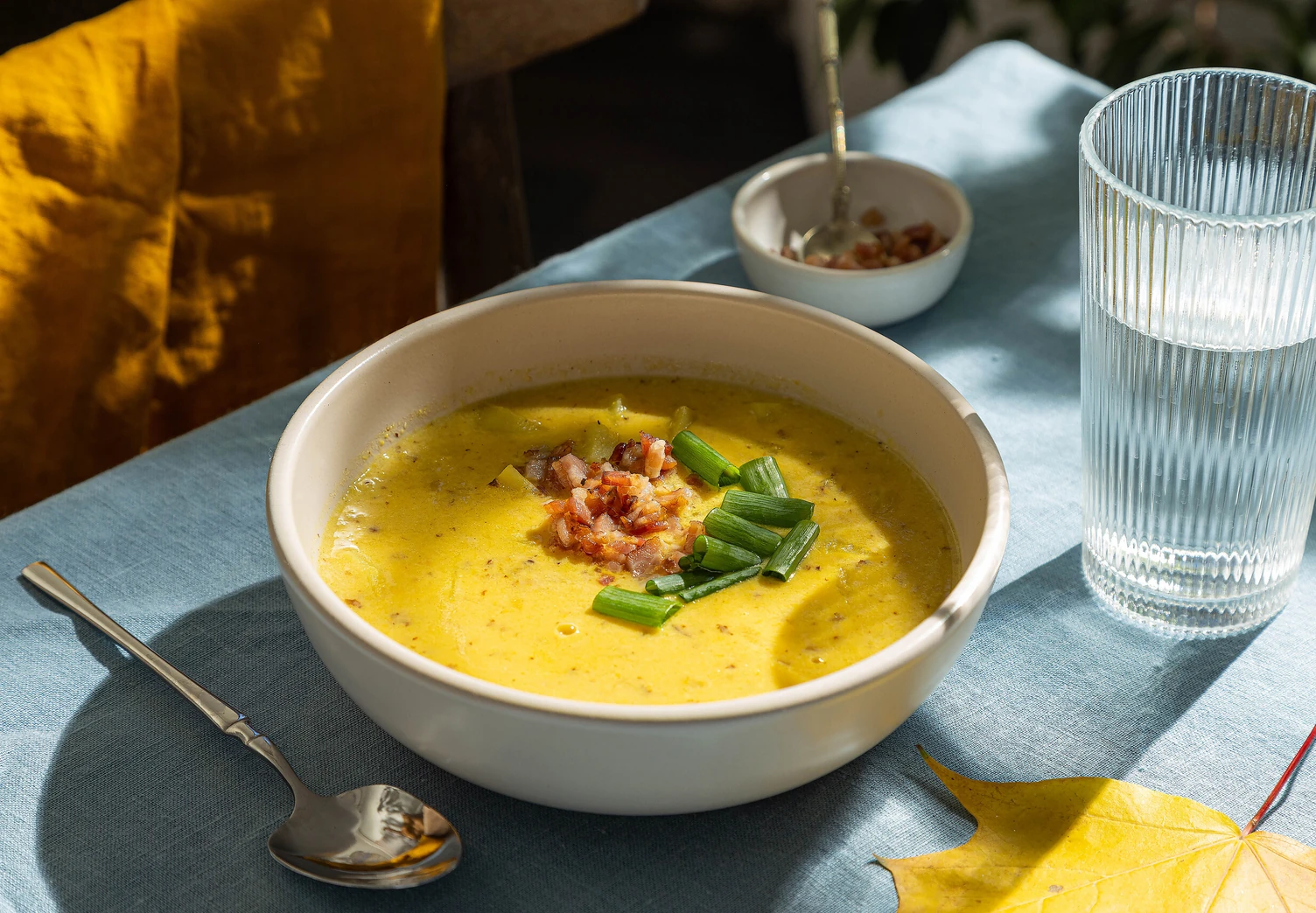 Знакомьтесь — чаудер, суп с богатой историей. Ему уже больше 300 лет, а он до сих пор остаётся таким же популярным! И это неудивительно, ведь само слово «чаудер» переводится как «котёл» — то есть, в него можно отправить всё самое вкусное, что есть под рукой. Классического рецепта не существует: такой суп готовят и с морепродуктами, и с рыбой, и с колбасками. Мы предлагаем вариант чаудера с кукурузой и хрустящим беконом.