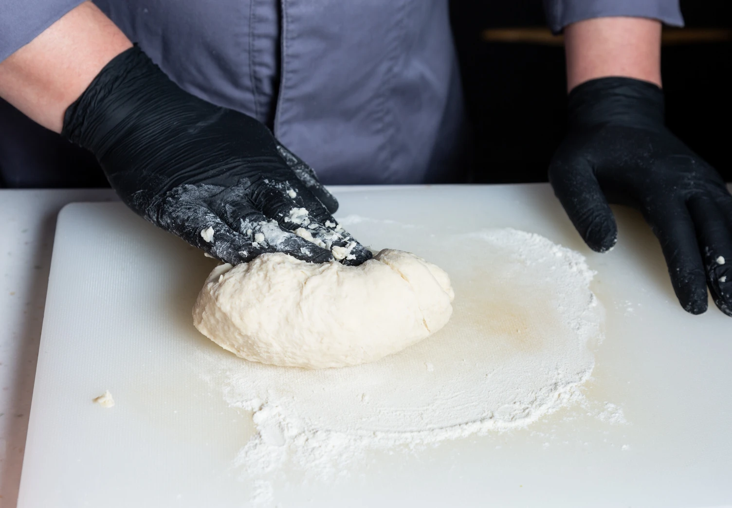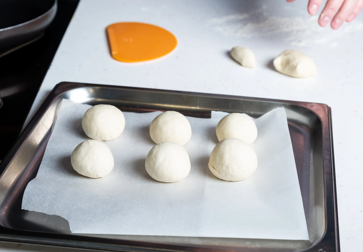 Затем разделите тесто на шарики по 100 г, накройте их полотенцем или плёнкой и оставьте на расстойку ещё на 10 минут.