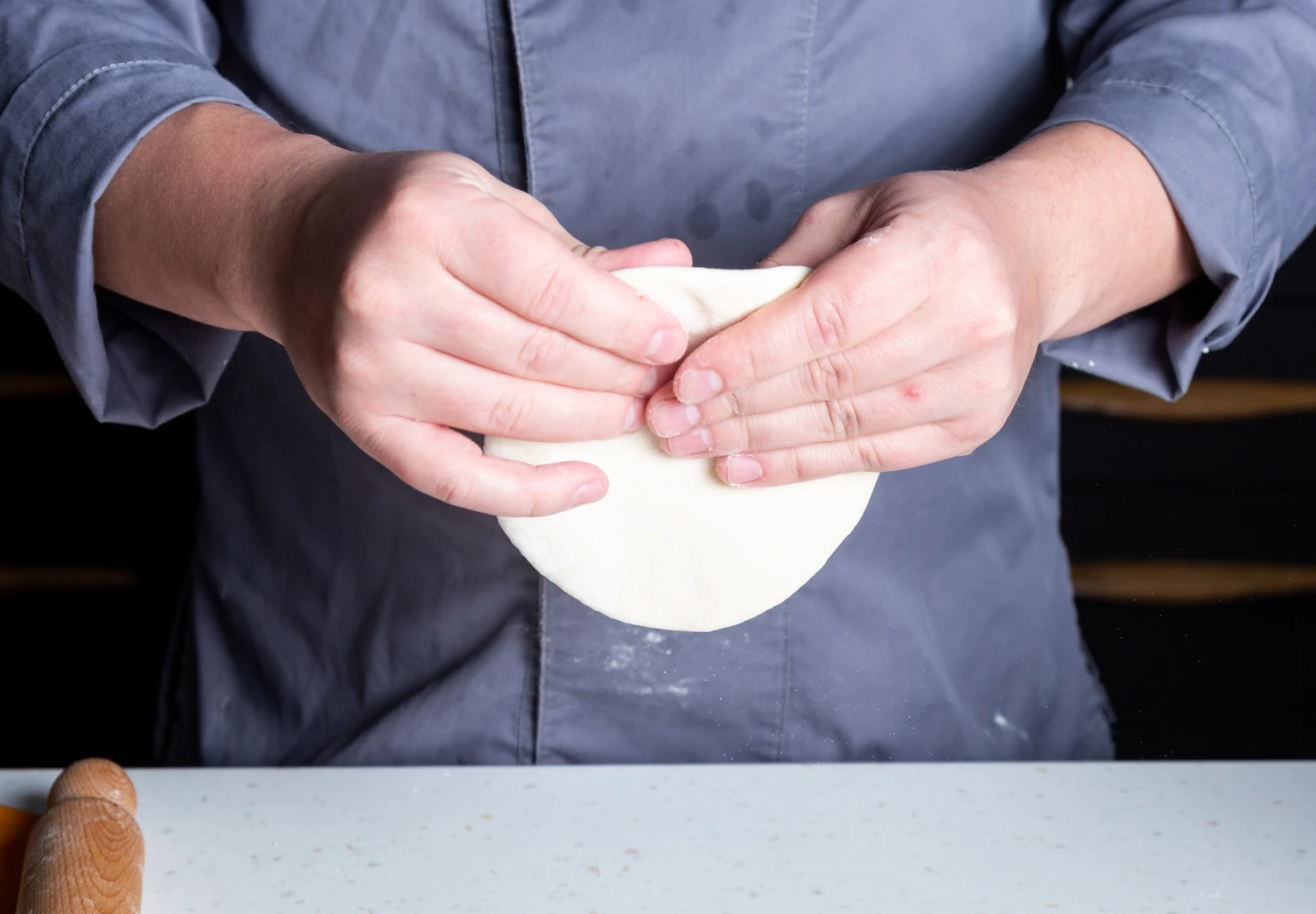 На присыпанной мукой рабочей поверхности раскатайте шарики теста в тонкие лепёшки.