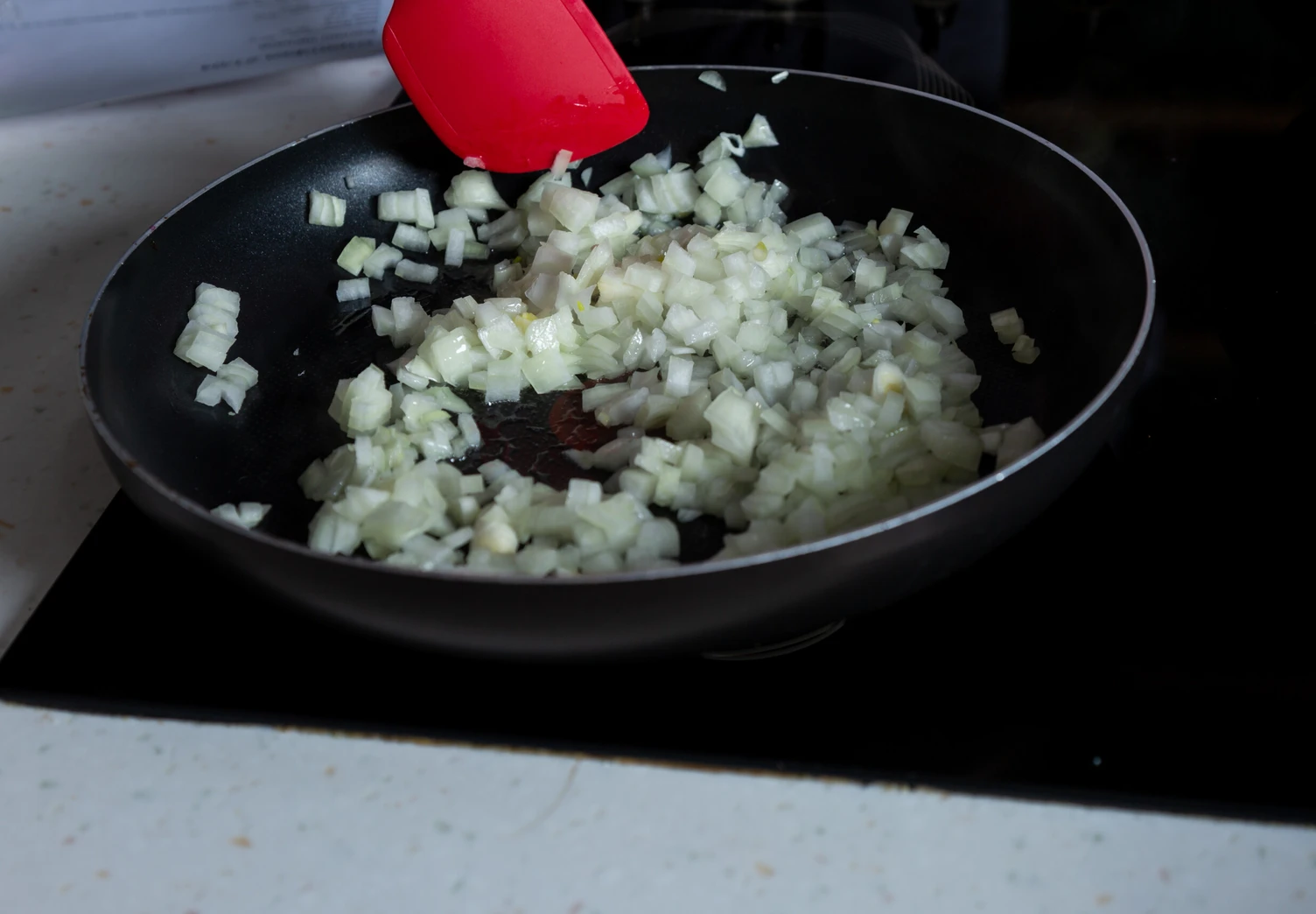 Для начинки репчатый лук мелко порубите и обжарьте на небольшом количестве растительного масла до золотистого цвета, затем добавьте воду и выпарите её. Остудите лук.