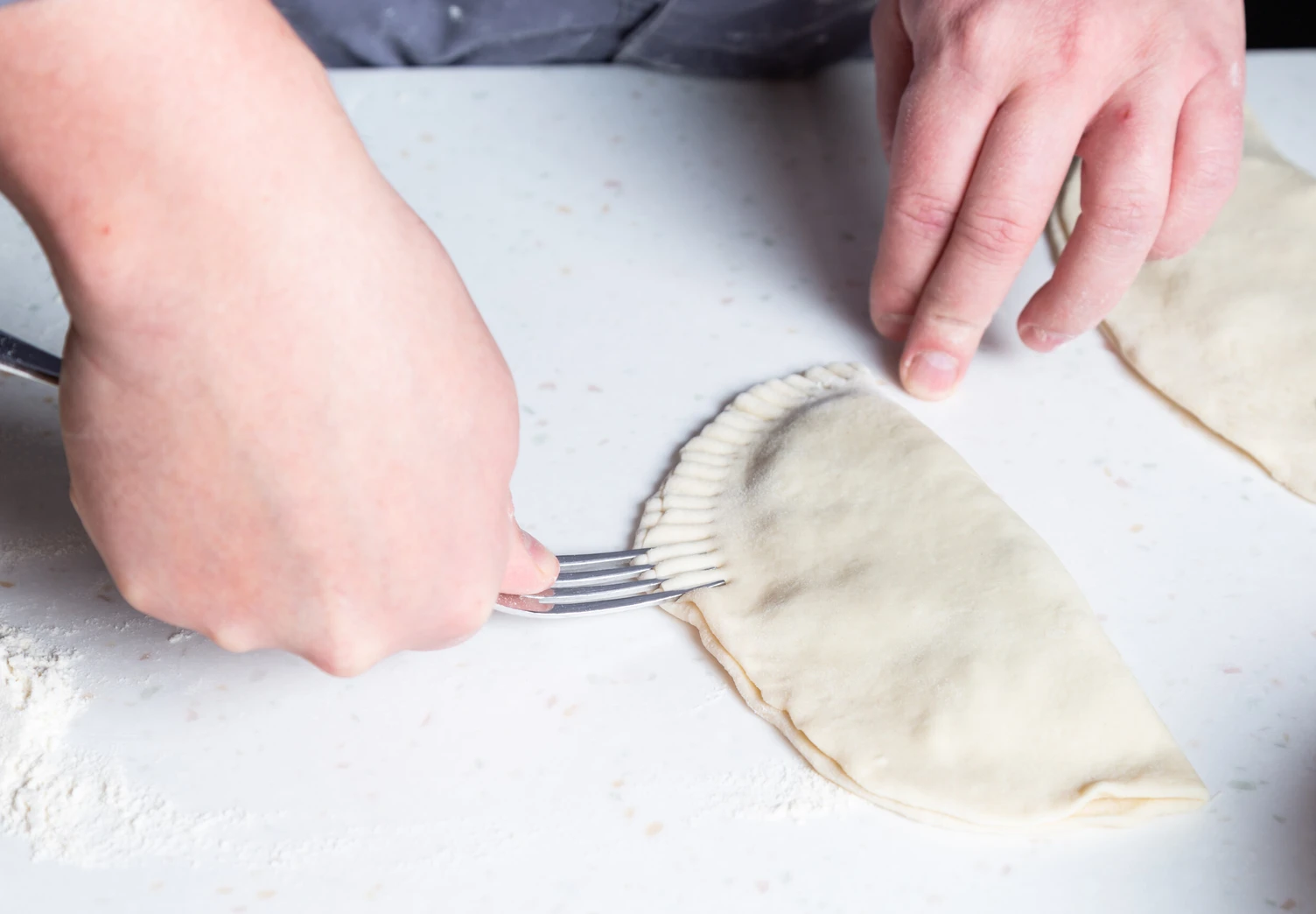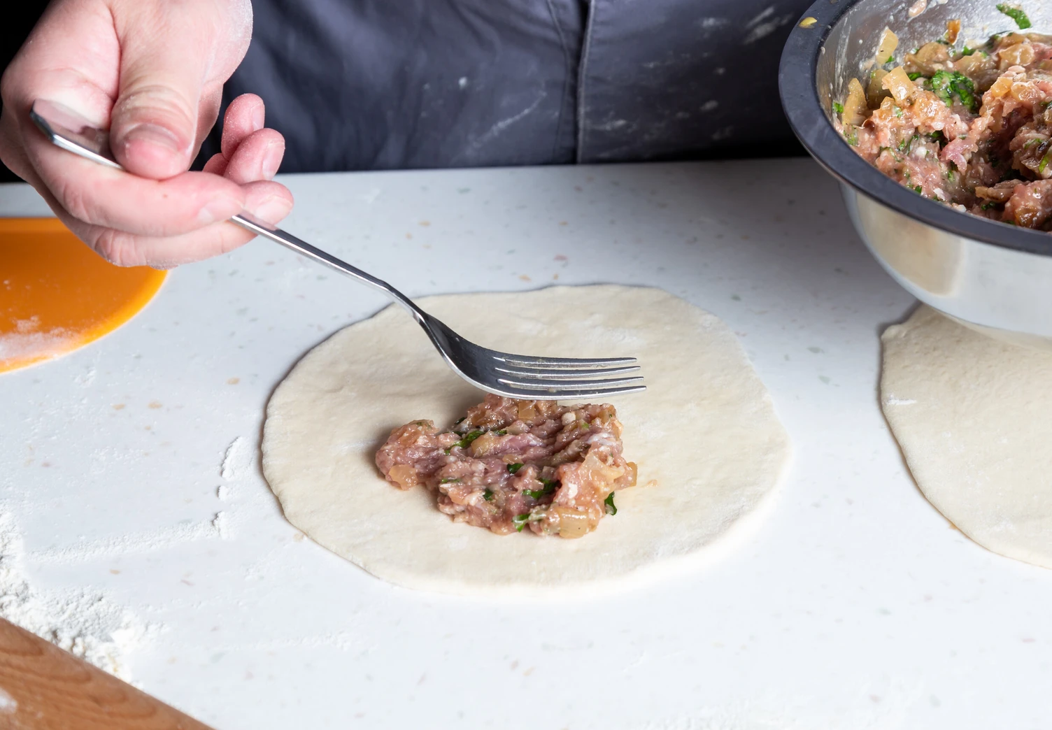 На одну половину каждого раскатанного кружка теста выложите примерно 70 г фарша.