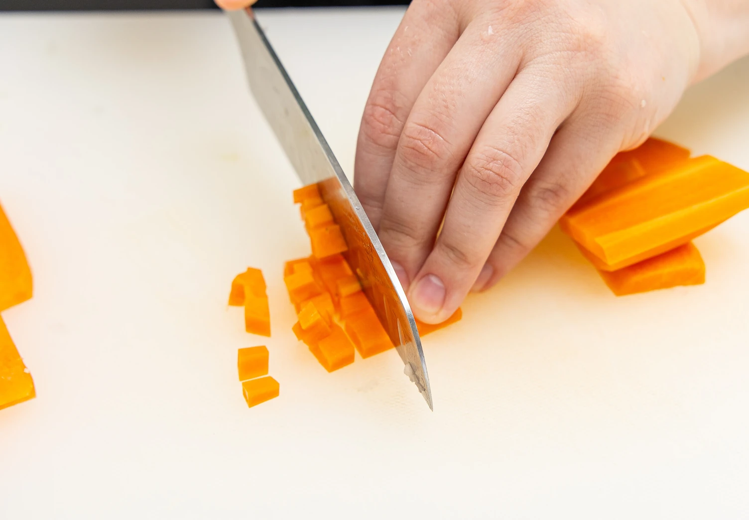 Очищенные морковь и лук нарежьте мелким кубиком, чеснок мелко порубите.