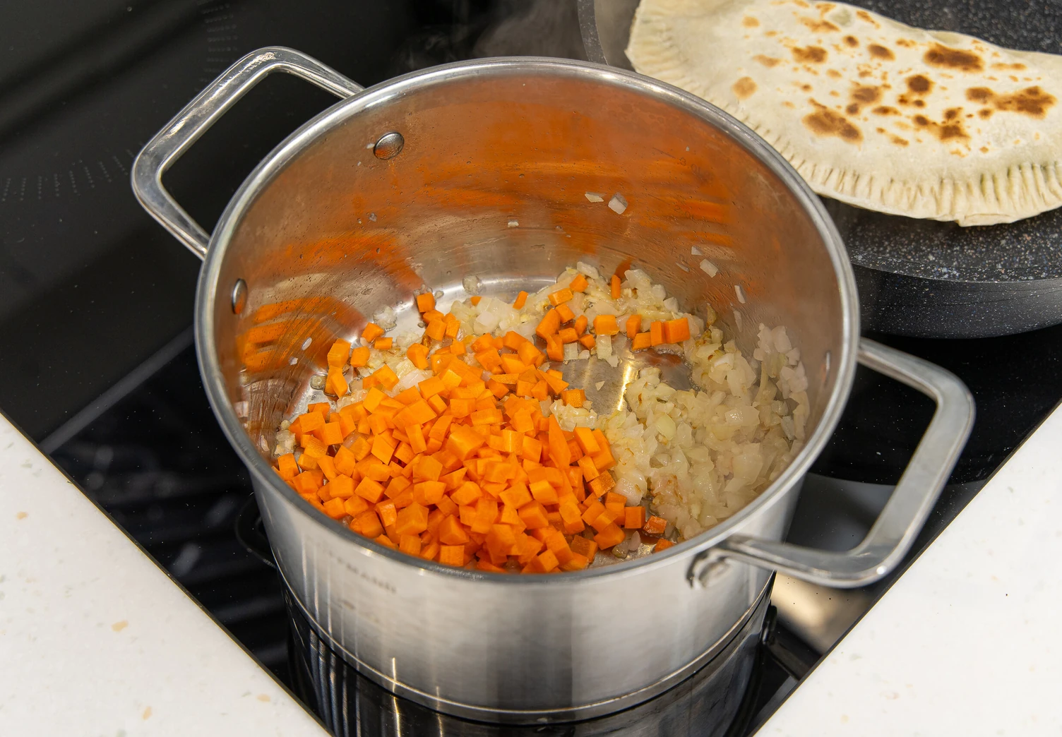 Выложите в кастрюлю подготовленные морковь и чеснок, перемешайте. Обжаривайте овощи ещё примерно 3–4 минуты.
