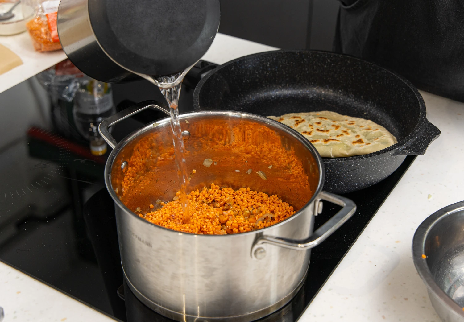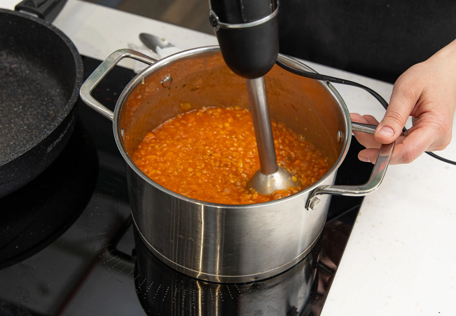Влейте горячую воду или овощной бульон, перемешайте. Увеличьте нагрев плиты и доведите суп до кипения. Убавьте огонь до слабого и варите суп ориентировочно 20–25 минут до полной мягкости овощей и чечевицы.