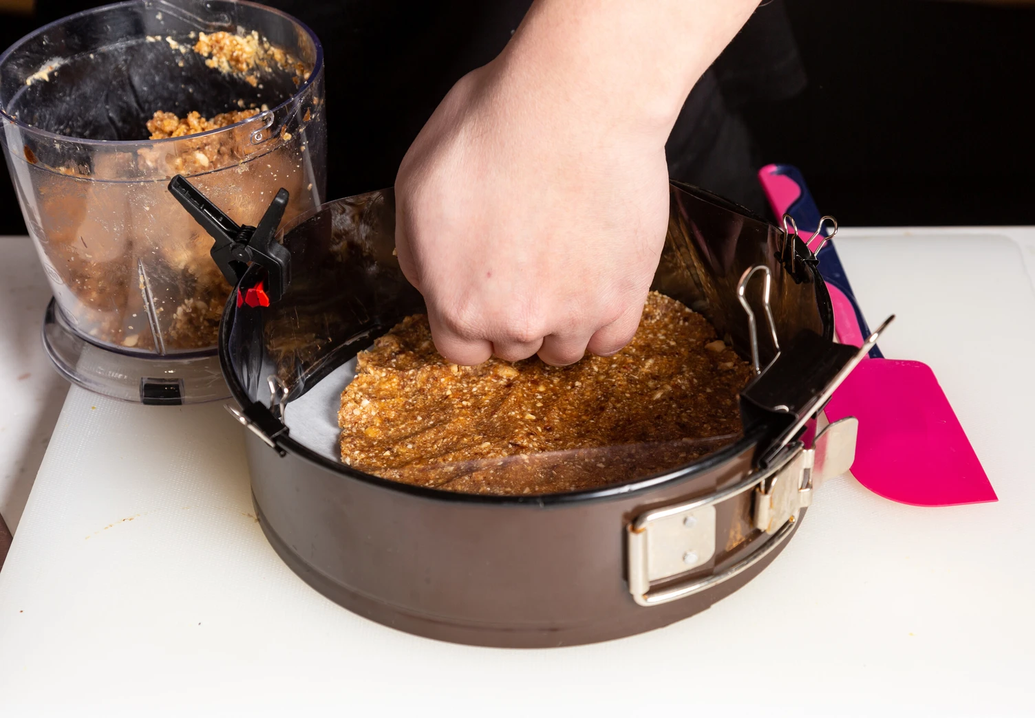 Для коржа пробейте блендером финики, фундук и арахисовую пасту. Из полученной массы слепите корж по диаметру разъёмной формы (мы использовали форму 20 см) и уберите в морозилку.