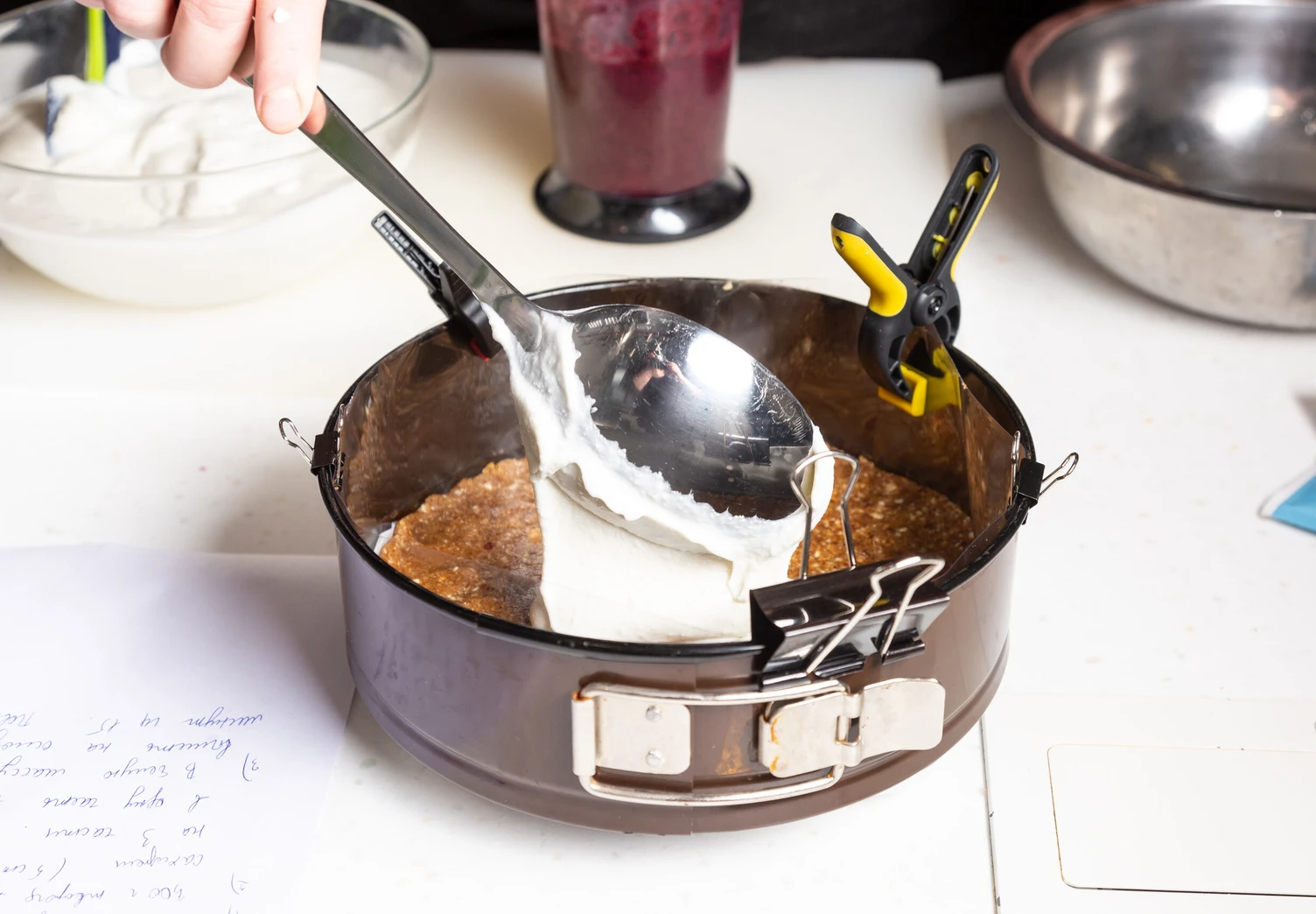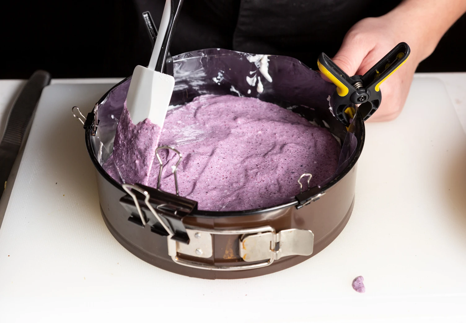 Оберните бортики разъёмной формы пищевой плёнкой или бордюрной лентой.