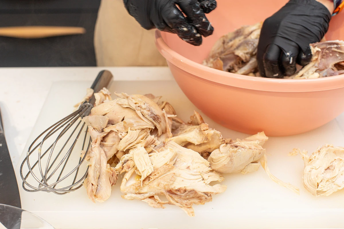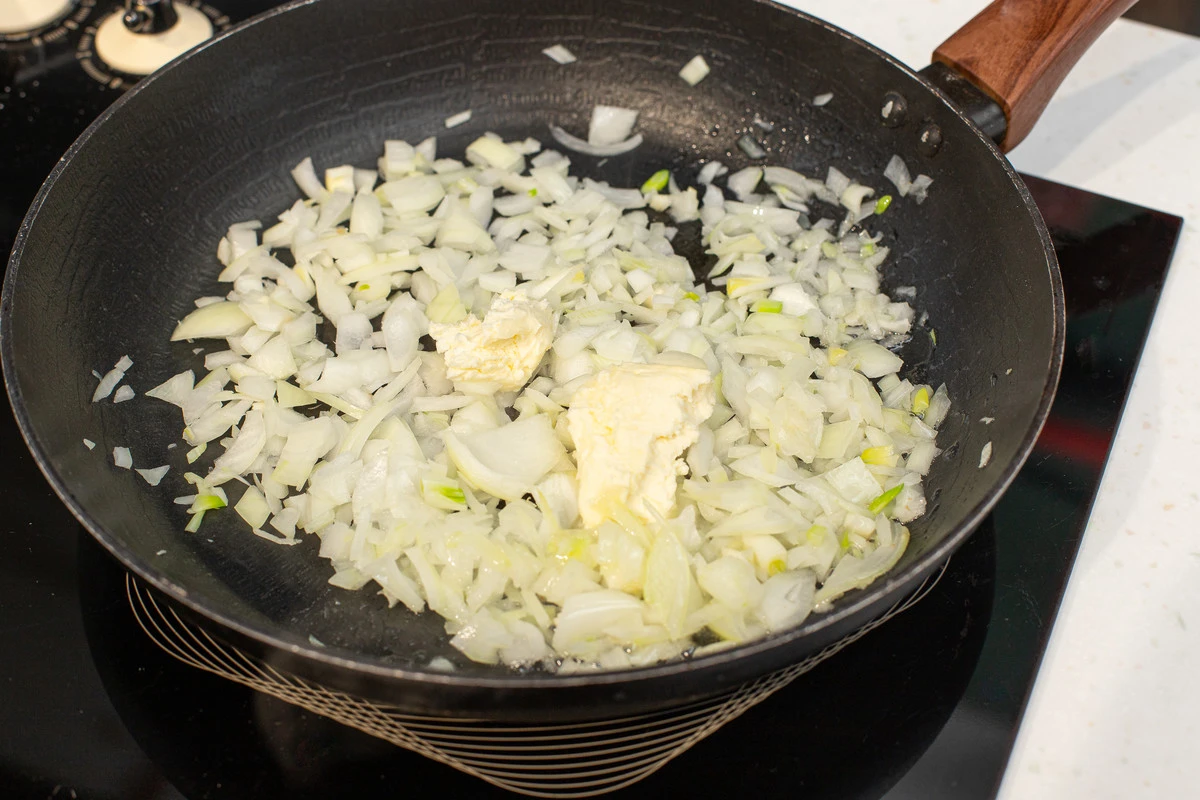 Курицу промойте, положите в большую кастрюлю, залейте водой и отварите до тех пор, пока не начнёт отделяться от костей, в течение 1,5 часов или больше, если потребуется. Ни соль, ни специи, ни лук, ни какие-либо другие ингредиенты на этом этапе класть не нужно. Остудите. Лук мелко нарежьте. Разогрейте сковороду, налейте 1 ст. л. растительного масла и положите 10–15 г сливочного, выложите лук и обжарьте до золотистого цвета в течение примерно 7 минут, периодически помешивая.