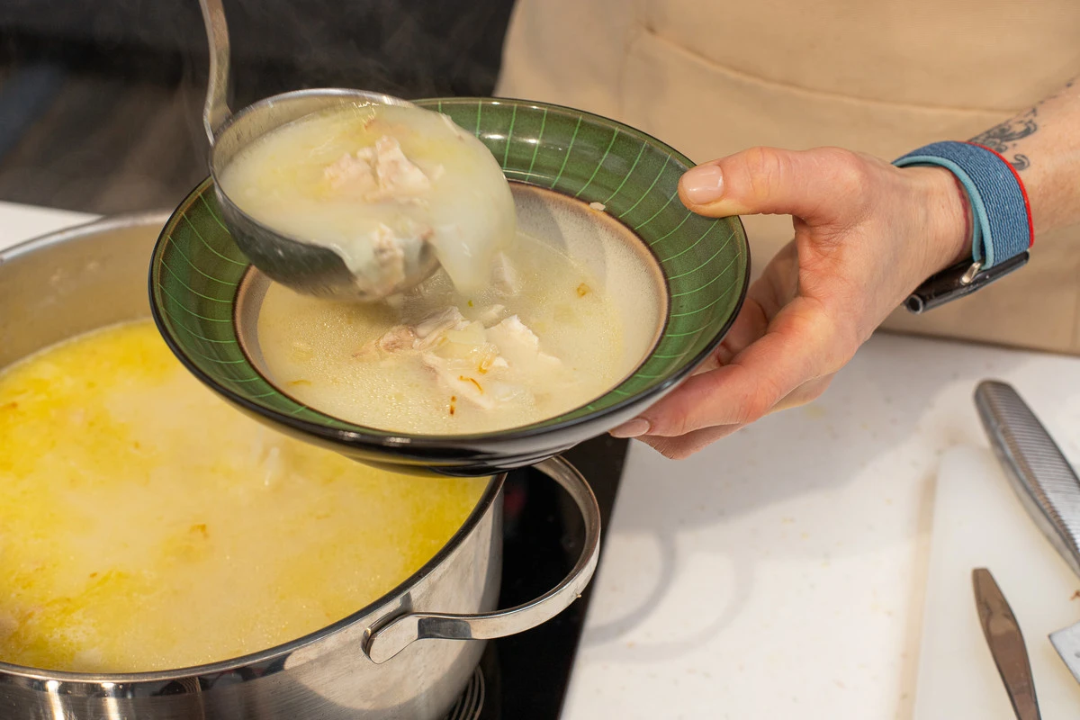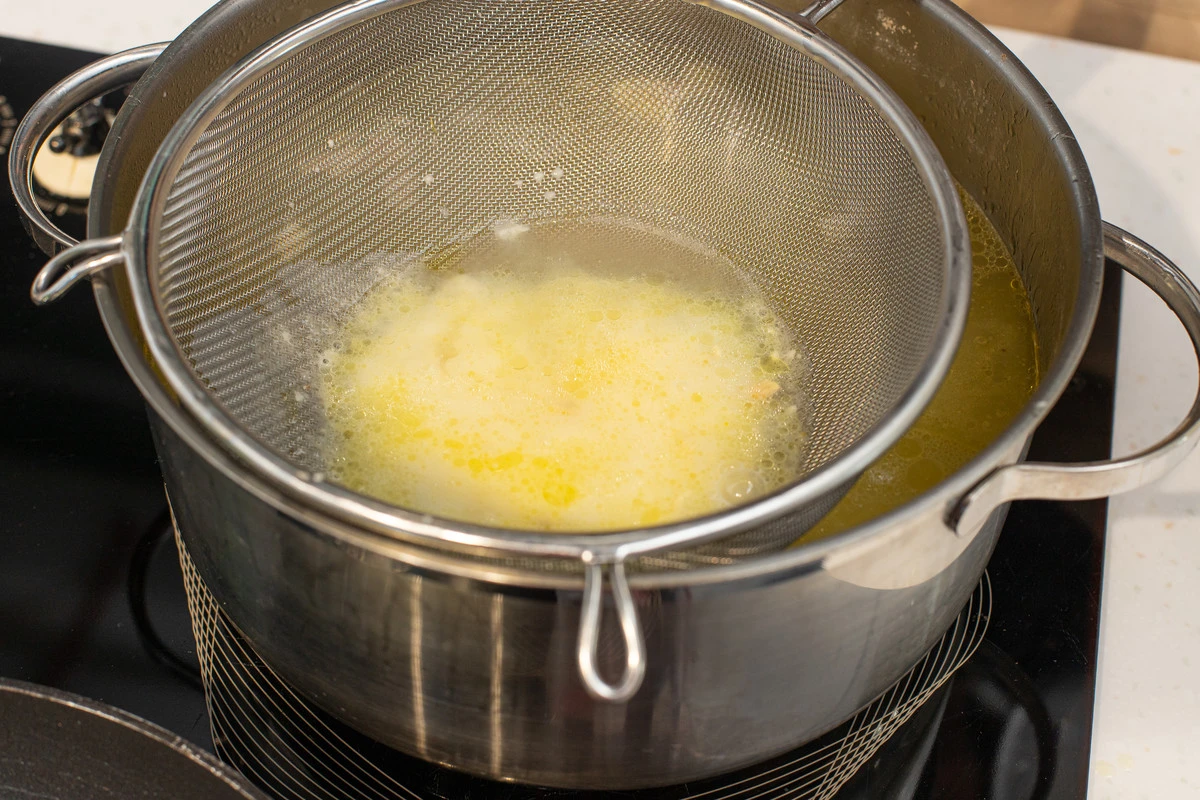 Процедите через сито яичную смесь, чтобы убрать косточки лимона, если случайно попали, и также добавьте в бульон.