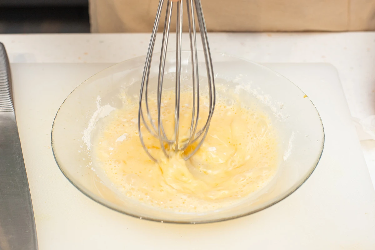 Смешайте венчиком муку с 100 мл воды, добавьте желтки, перемешайте.