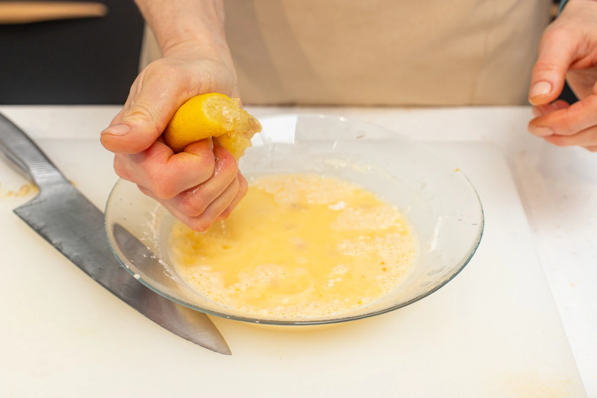 Влейте сок лимонов и снова перемешайте. Должна получиться смесь, по консистенции напоминающая жидкое тесто для блинчиков.