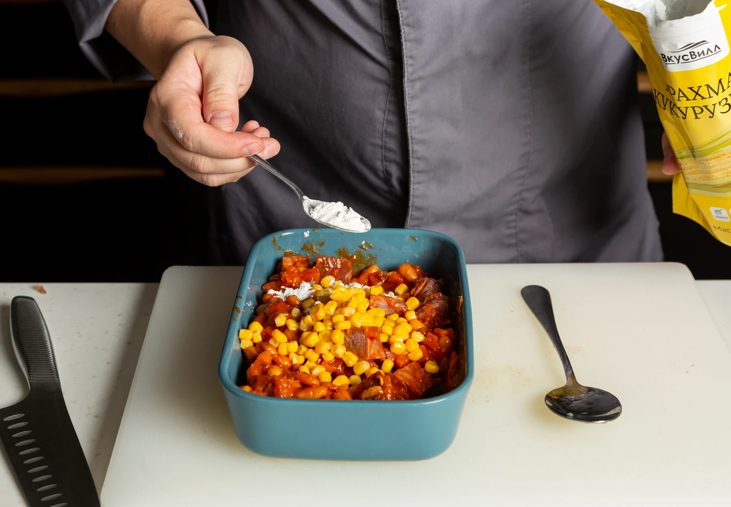Смешайте мясо с фасолью, кукурузой и крахмалом.