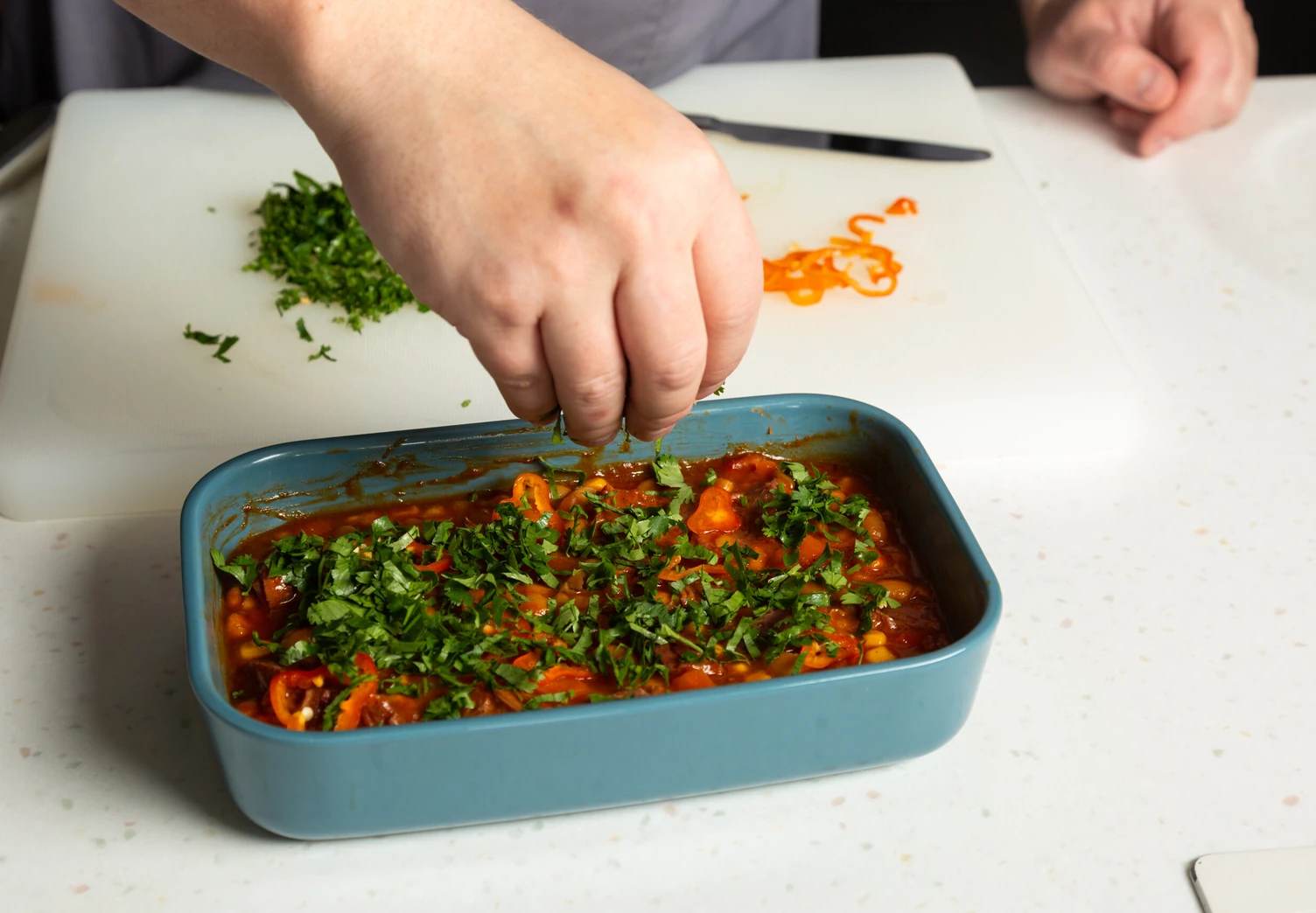Готовое блюдо украсьте колечками хабанеро и рубленой кинзой.