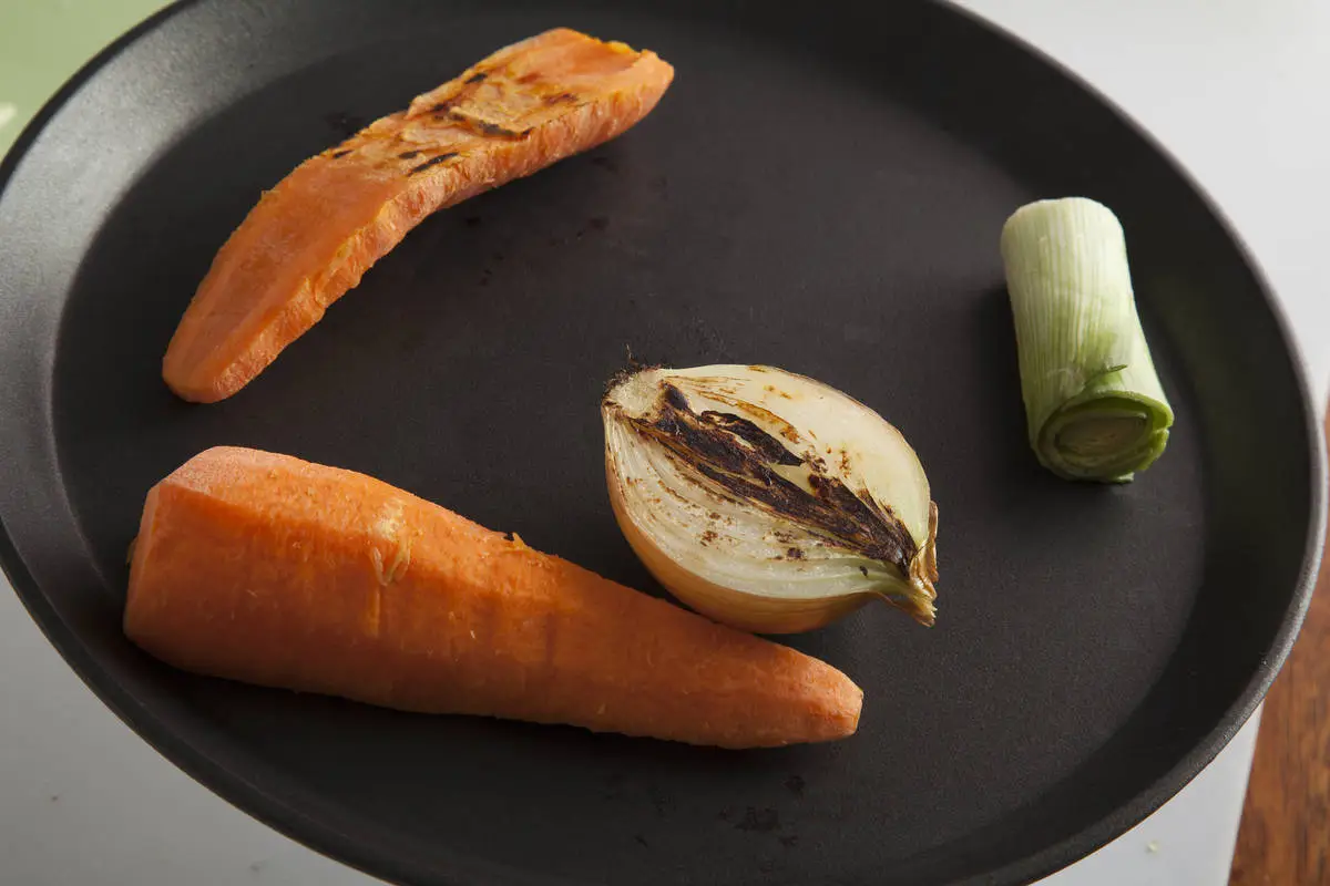 Одну луковицу и одну морковку разрежьте пополам и поджарьте на сухой сковороде до коричневых подпалин.