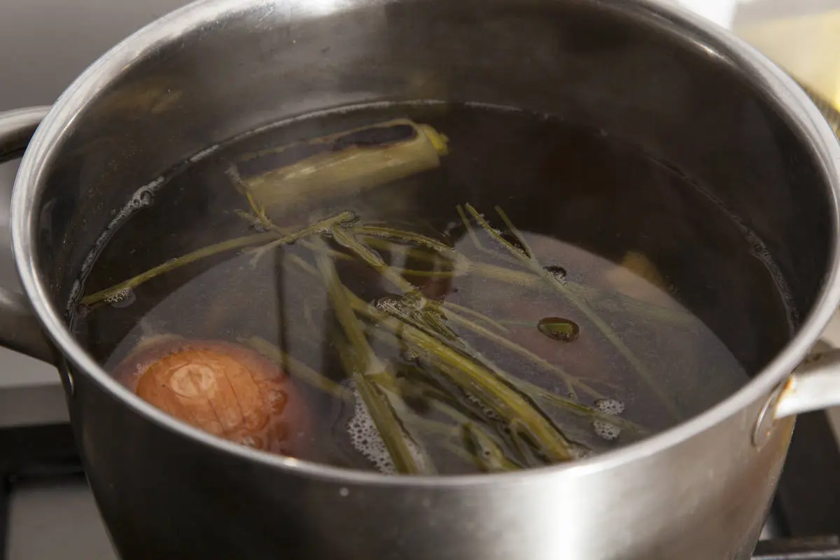 Положите в кастрюлю вместе с кожей и плавниками конгрио, добавьте перец горошком и лавровый лист, залейте холодной водой, доведите до кипения и варите на медленном огне час.