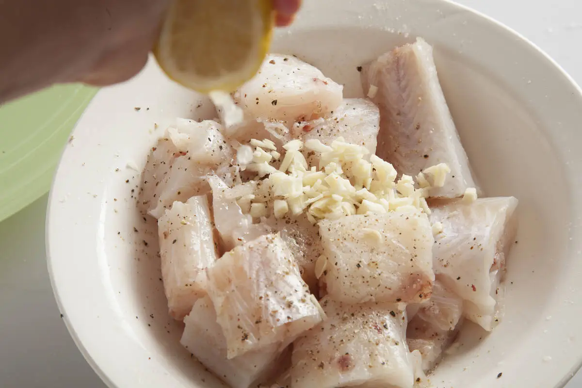 Рыбу нарежьте порционными кусками, посолите, поперчите, добавьте базилик, орегано и рубленый чеснок, полейте соком из половинки лимона, перемешайте и оставьте мариноваться.