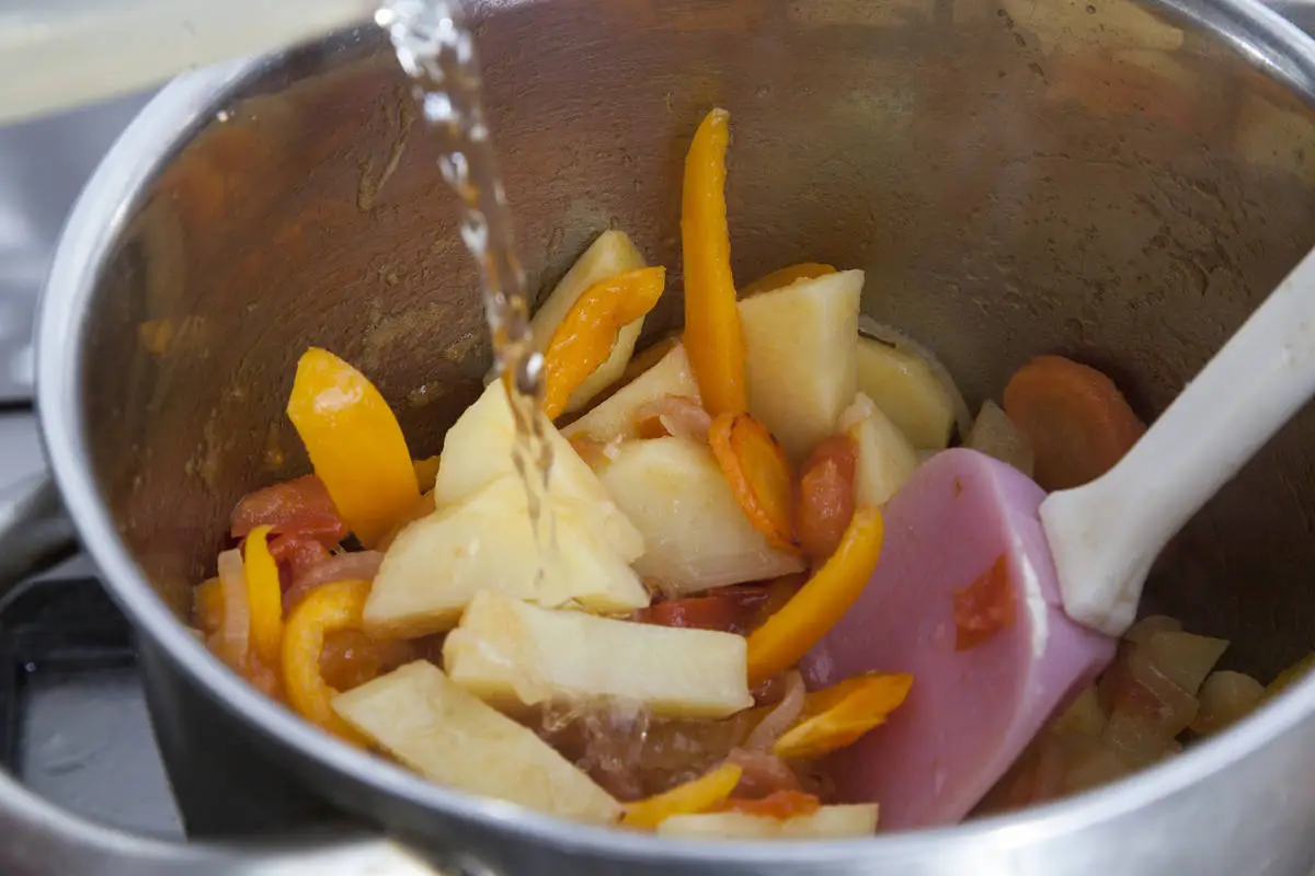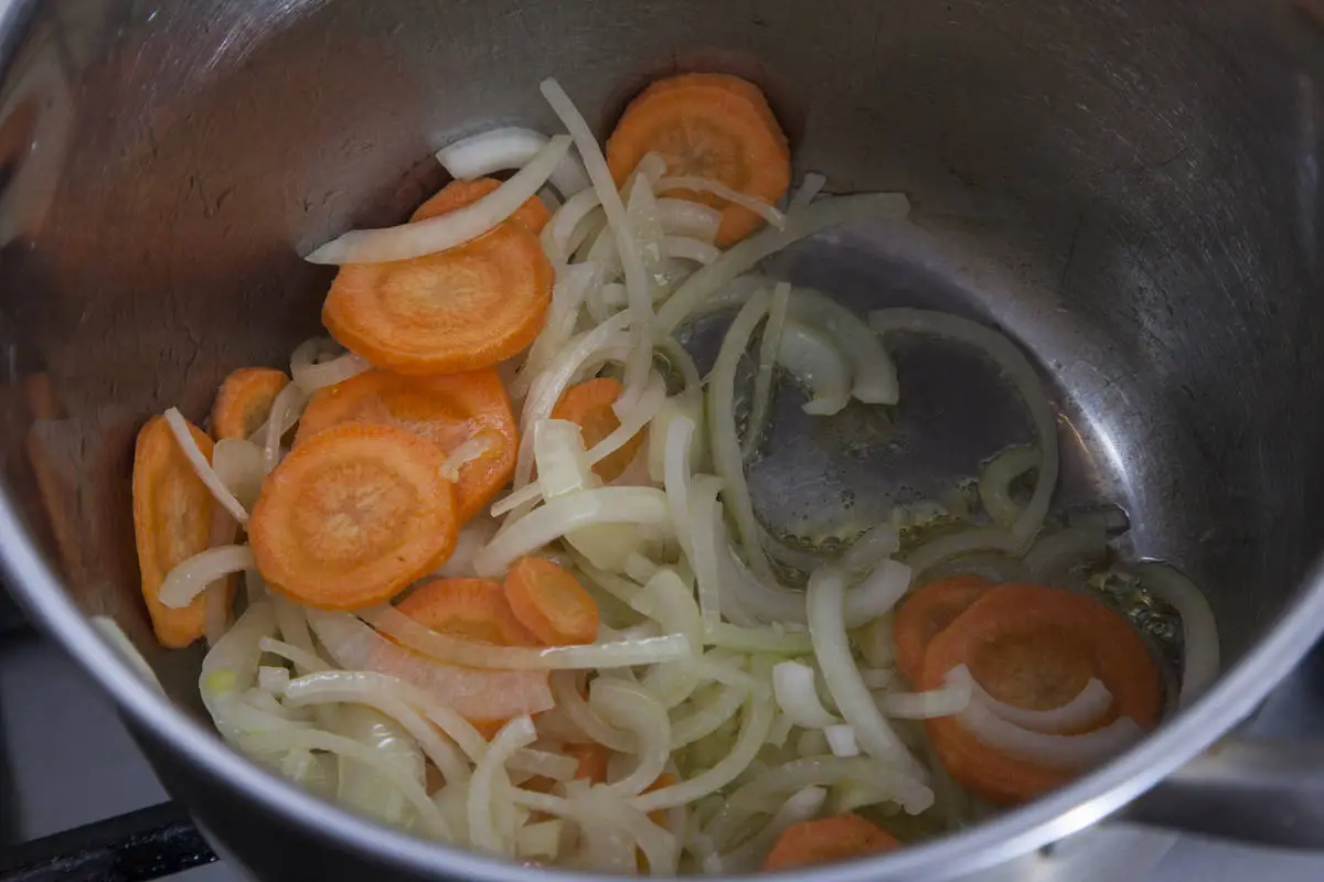 Оставшуюся луковицу нарежьте тонкими полукольцами, морковь кружочками. В кастрюле разогрейте оливковое масло, спассеруйте лук, морковь, затем добавьте порезанный кубиками помидор, еще через 2-3 минуты порезанный перец и картошку кубиками.