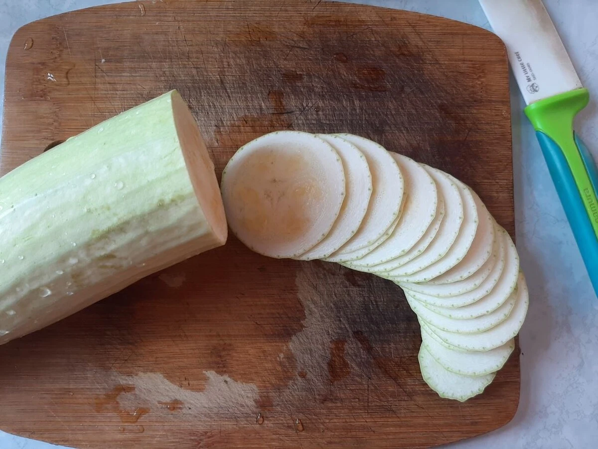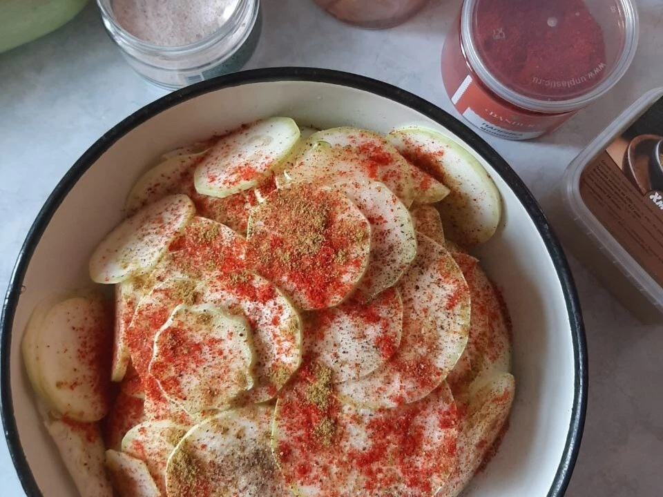 Нарежьте кабачки на тонкие кружочки примерно 3–4 мм толщиной. Выложите кружочки в ёмкость.