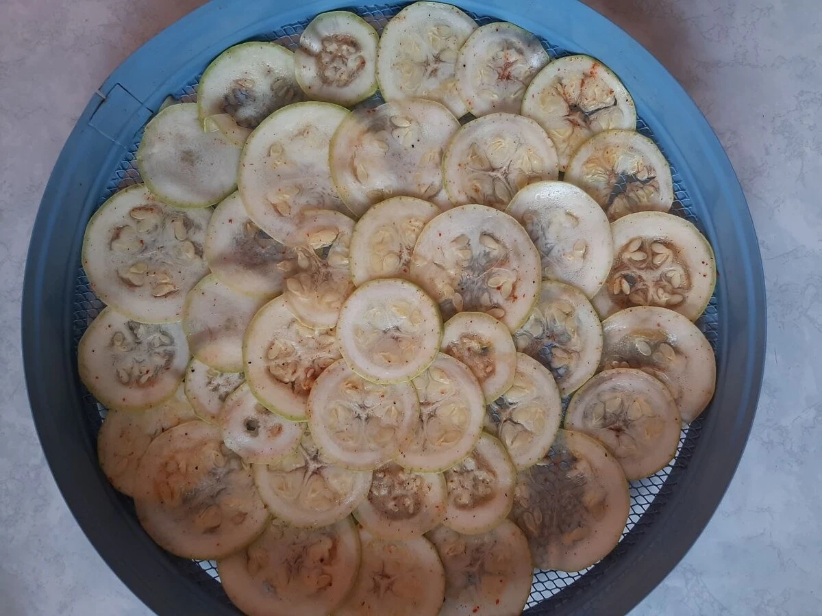 Затем слейте образовавшуюся жидкость (её можно использовать в соусах). Выложите кабачки на поддоны для сушилки и поставьте сушить на 12 часов при температуре 40 ℃. Если у вас нет сушилки для овощей и фруктов, можно поставить кабачки в духовку с режимом «Вентиляция» при температуре 50 ℃.