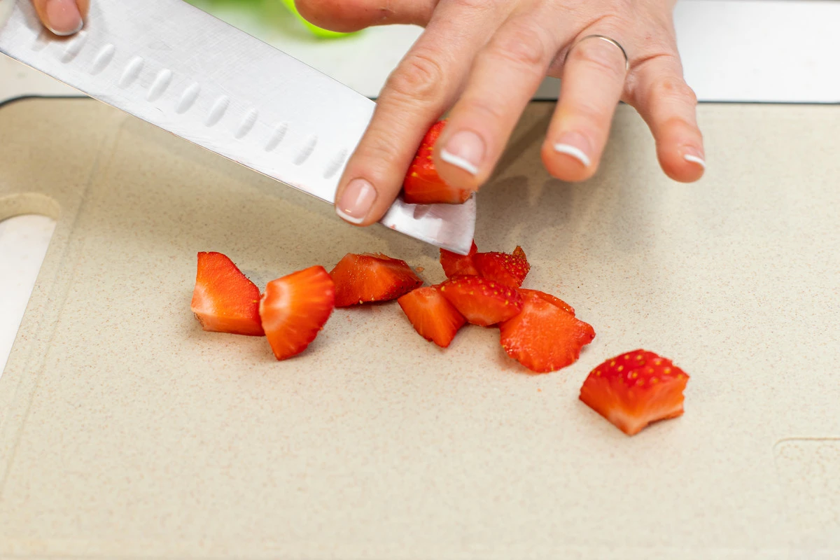 Клубнику помойте, обсушите. Удалите зелёные «хвостики» и разрежьте ягоды пополам.