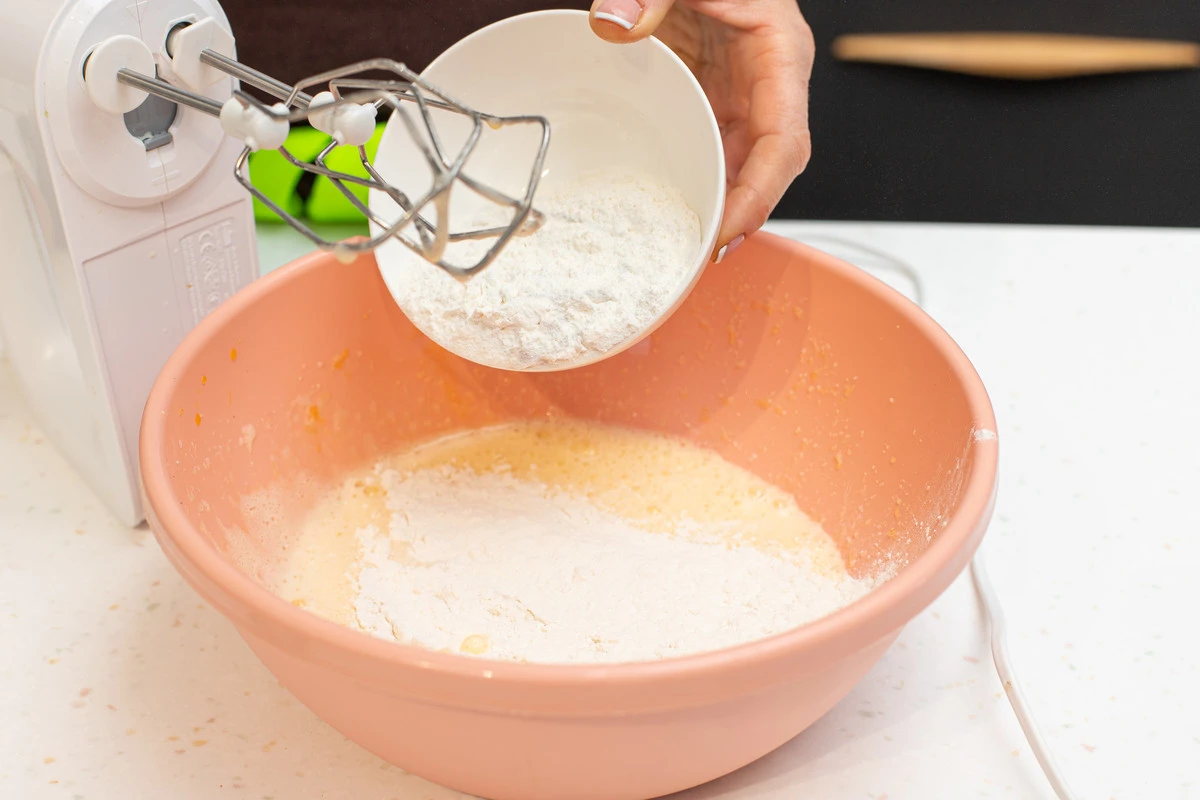 Влейте растопленное сливочное масло и просейте муку с разрыхлителем. Перемешайте.